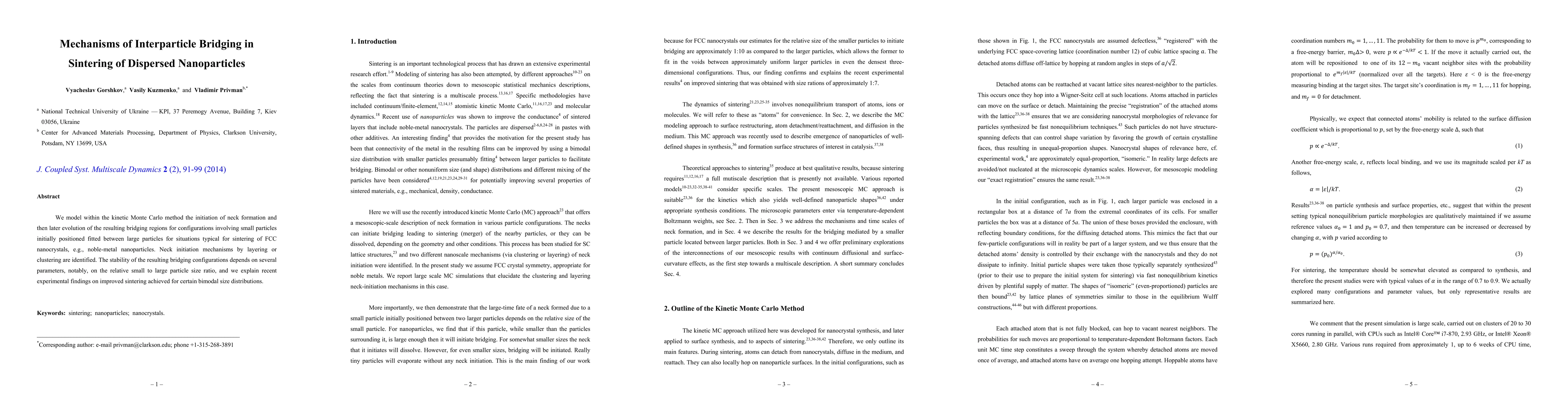 This paper uses kinetic Monte Carlo simulations to model the neck formation and evolution in sintering of dispersed nanoparticles, identifying layering and clustering as neck initiation mechanisms. The stability of bridging configurations is shown to depend on the small to large particle size ratio, explaining improved sintering in certain bimodal size distributions.
