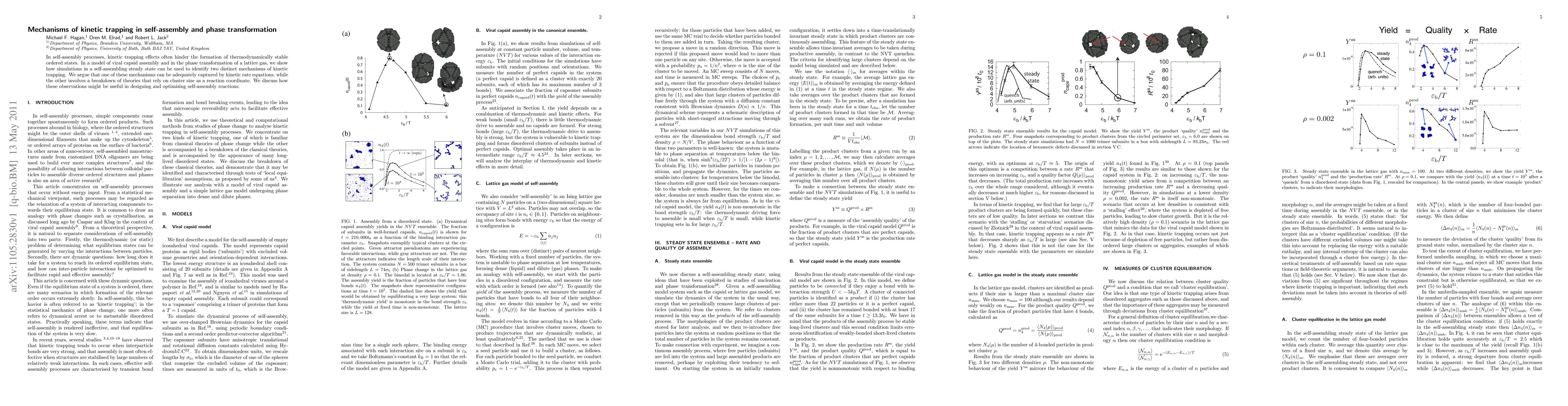 This paper identifies two mechanisms of kinetic trapping in self-assembly processes, demonstrating their presence in viral capsid assembly and lattice gas phase transformation. It highlights that one mechanism aligns with kinetic rate equations, while the other challenges existing theories based on cluster size.