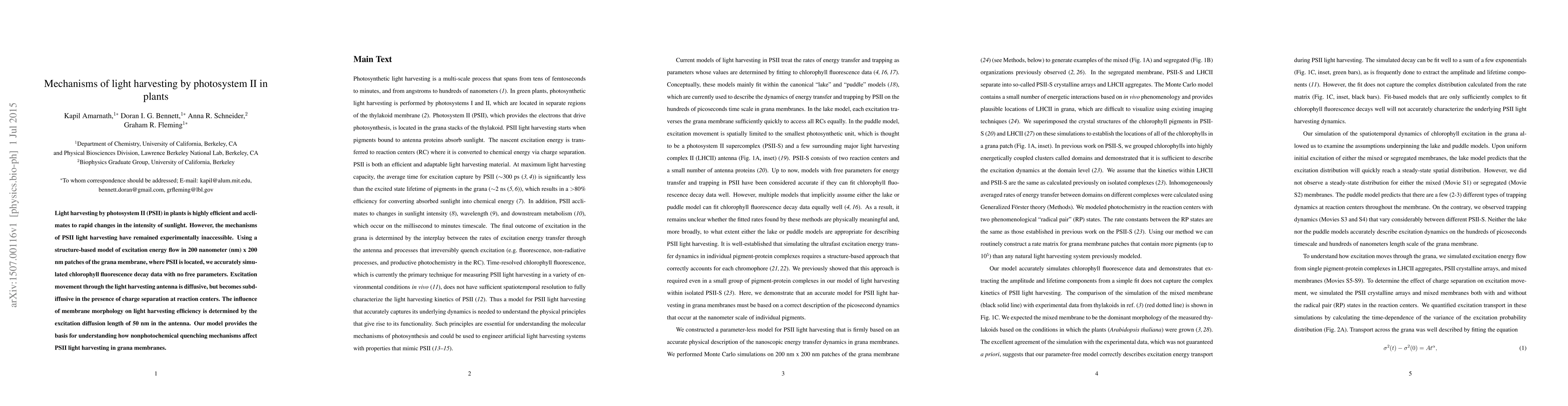 The research elucidates the mechanisms of light harvesting by photosystem II in plants, demonstrating that excitation energy transfer is diffusive but becomes subdiffusive with charge separation. The study uses a structure-based model to simulate chlorophyll fluorescence, highlighting the 50 nm excitation diffusion length and the role of grana membrane morphology in enhancing light harvesting efficiency.