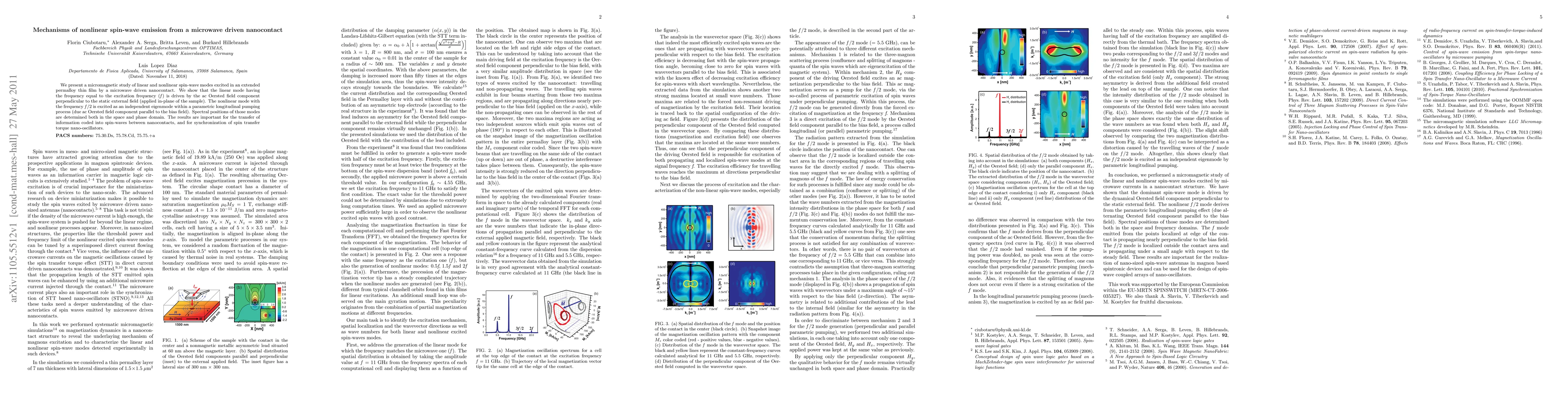 Researchers studied spin-wave emission in a nanocontact driven by microwaves, discovering two modes with frequencies f and f/2 that can encode information and synchronize nanoscale oscillators.