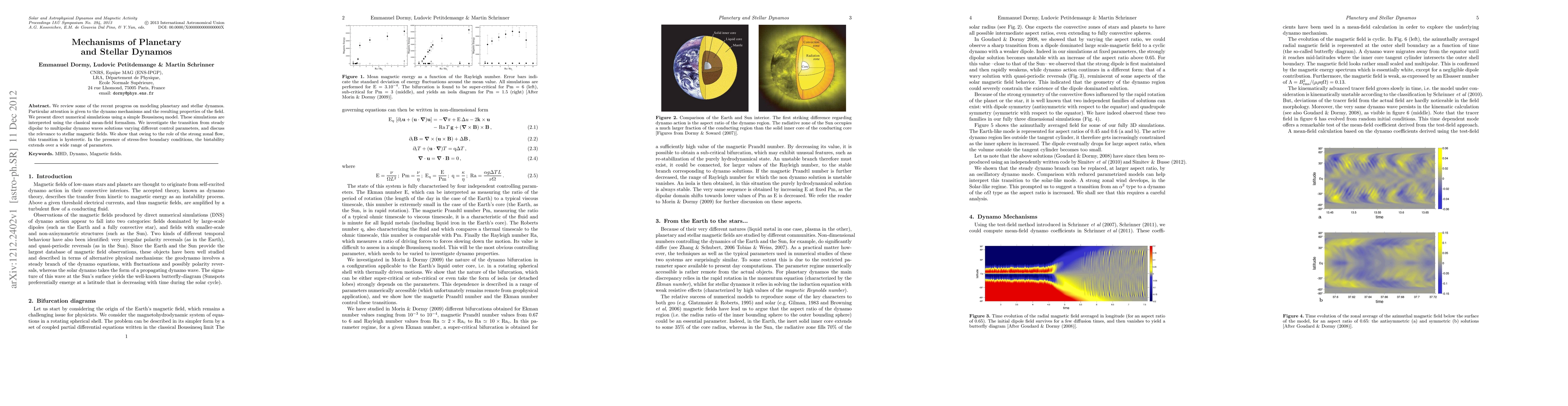 We review some of the recent progress on modeling planetary and stellar dynamos. Particular attention is given to the dynamo mechanisms and the resulting properties of the field. We present direct numerical simulations using a simple Boussinesq model. These simulations are interpreted using the classical mean-field formalism. We investigate the transition from steady dipolar to multipolar dynamo waves solutions varying different control parameters, and discuss the relevance to stellar magnetic fields. We show that owing to the role of the strong zonal flow, this transition is hysteretic. In the presence of stress-free boundary conditions, the bistability extends over a wide range of parameters.