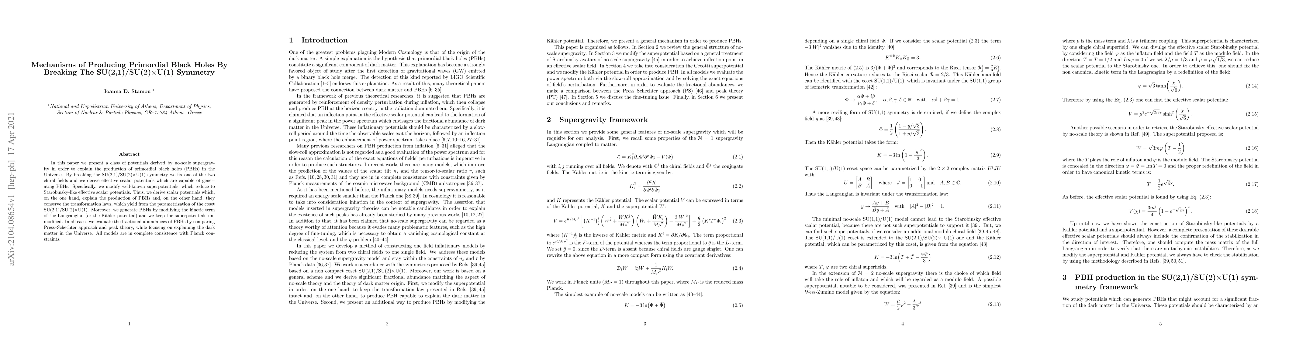 In this paper we present a class of potentials derived by no-scale supergravity in order to explain the production of primordial black holes (PBHs) in the Universe. By breaking the SU(2,1)/SU(2)$\times$U(1) symmetry we fix one of the two chiral fields and we derive effective scalar potentials which are capable of generating PBHs. Specifically, we modify well-known superpotentials, which reduce to Starobinsky-like effective scalar potentials. Thus, we derive scalar potentials which, on the one hand, explain the production of PBHs and, on the other hand, they conserve the transformation laws, which yield from the parametrization of the coset SU(2,1)/SU(2)$\times$U(1). Moreover, we generate PBHs by modifying the kinetic term of the Langrangian (or the K\"ahler potential) and we keep the superpotentials unmodified. In all cases we evaluate the fractional abundances of PBHs by comparing Press-Schechter approach and peak theory, while focusing on explaining the dark matter in the Universe. All models are in complete consistence with Planck constraints.