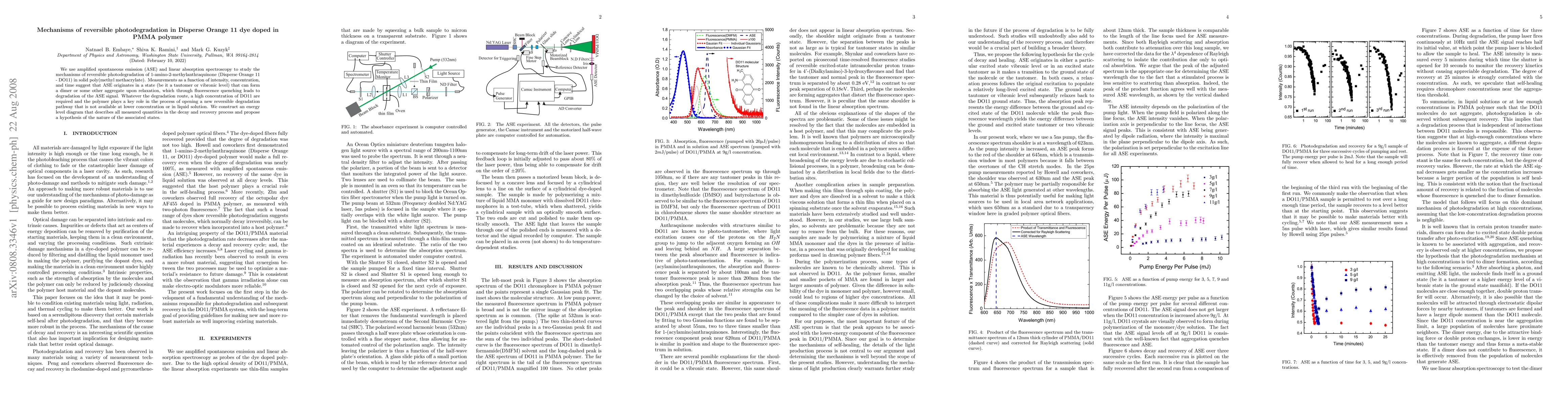 This study investigates the reversible photodegradation of disperse orange 11 dye in PMMA polymer using ASE and absorption spectroscopy. The findings suggest that high dye concentration and polymer matrix enable a unique reversible degradation pathway, likely involving dye aggregation and fluorescence quenching.