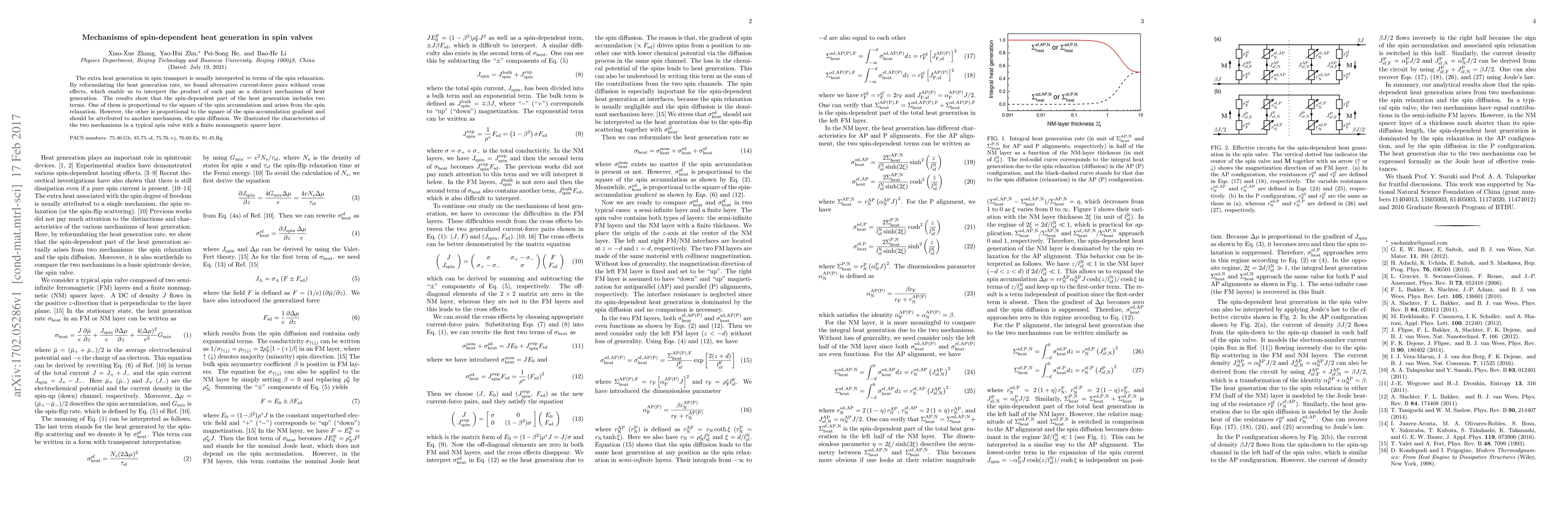 This paper identifies two distinct mechanisms for spin-dependent heat generation in spin valves: one linked to spin relaxation and the other to spin diffusion, characterized by the spin accumulation gradient. The findings reveal that heat generation is not solely due to spin relaxation but also involves spin diffusion.