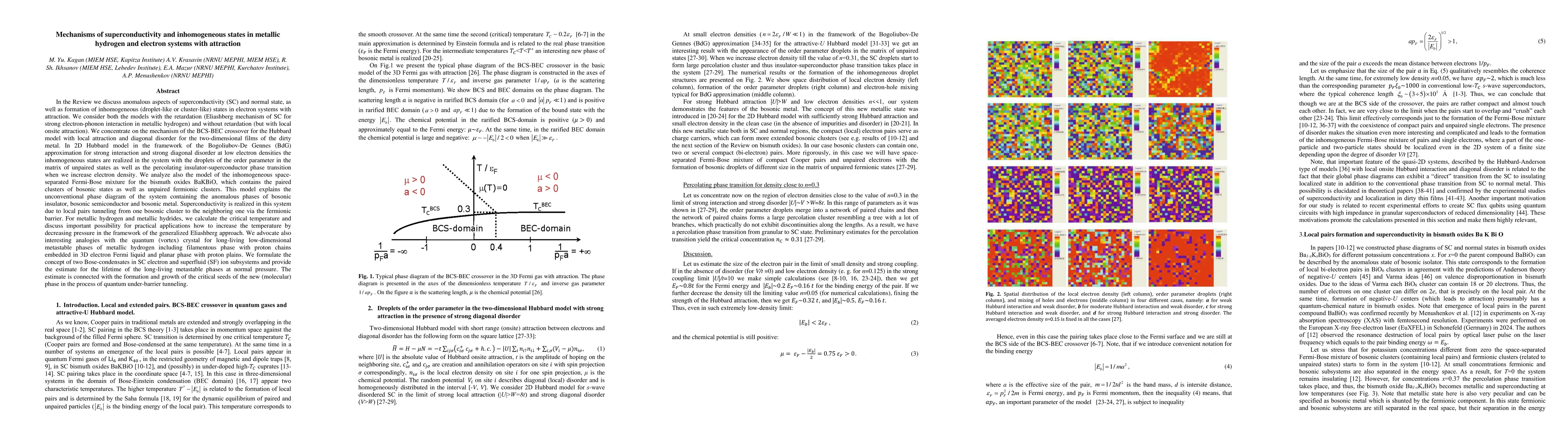 In the Review we discuss anomalous aspects of superconductivity (SC) and normal state, as well as formation of inhomogeneous (droplet-like or cluster-like) states in electron systems with attraction. We consider both the models with the retardation (Eliashberg mechanism of SC for strong electron-phonon interaction in metallic hydrogen) and without retardation (but with local onsite attraction). We concentrate on the mechanism of the BCS-BEC crossover for the Hubbard model with local attraction and diagonal disorder for the two-dimensional films of the dirty metal. We analyze also the model of the inhomogeneous spaceseparated Fermi-Bose mixture for the bismuth oxides BaKBiO, which contains the paired clusters of bosonic states as well as unpaired fermionic clusters. Superconductivity is realized in this system due to local pairs tunneling from one bosonic cluster to the neighboring one via the fermionic barrier. For metallic hydrogen and metallic hydrides, we calculate the critical temperature and discuss important possibility for practical applications how to increase the temperature by decreasing pressure in the framework of the generalized Eliashberg approach. We advocate also interesting analogies with the quantum (vortex) crystal for long-living low-dimensional metastable phases of metallic hydrogen including filamentous phase with proton chains embedded in 3D electron Fermi liquid and planar phase with proton plains. We formulate the concept of two Bose-condensates in SC electron and superfluid (SF) ion subsystems and provide the estimate for the lifetime of the long-living metastable phases at normal pressure. The estimate is connected with the formation and growth of the critical seeds of the new (molecular) phase in the process of quantum under-barrier tunneling.