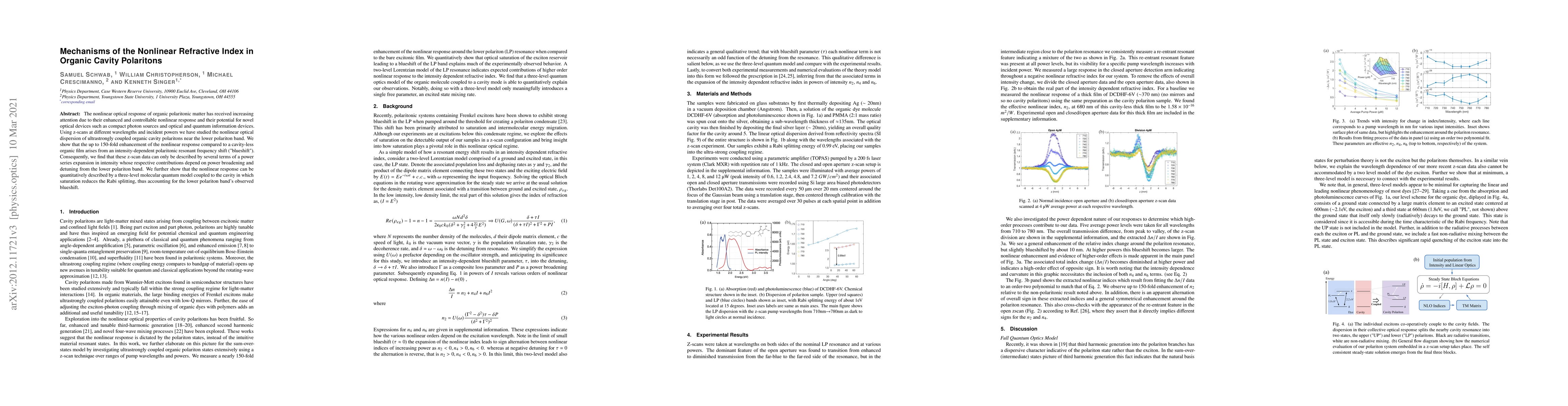 The nonlinear optical response of organic polaritonic matter has received increasing attention due to their enhanced and controllable nonlinear response and their potential for novel optical devices such as compact photon sources and optical and quantum information devices. Using z-scans at different wavelengths and incident powers we have studied the nonlinear optical dispersion of ultrastrongly coupled organic cavity polaritons near the lower polariton band. We show that the up to 150-fold enhancement of the nonlinear response compared to a cavity-less organic film arises from an intensity-dependent polaritonic resonant frequency shift ("blueshift"). Consequently, we find that these z-scan data can only be described by several terms of a power series expansion in intensity whose respective contributions depend on power broadening and detuning from the lower polariton band. We further show that the nonlinear response can be quantitatively described by a three-level molecular quantum model coupled to the cavity in which saturation reduces the Rabi splitting, thus accounting for the lower polariton band's observed blueshift.