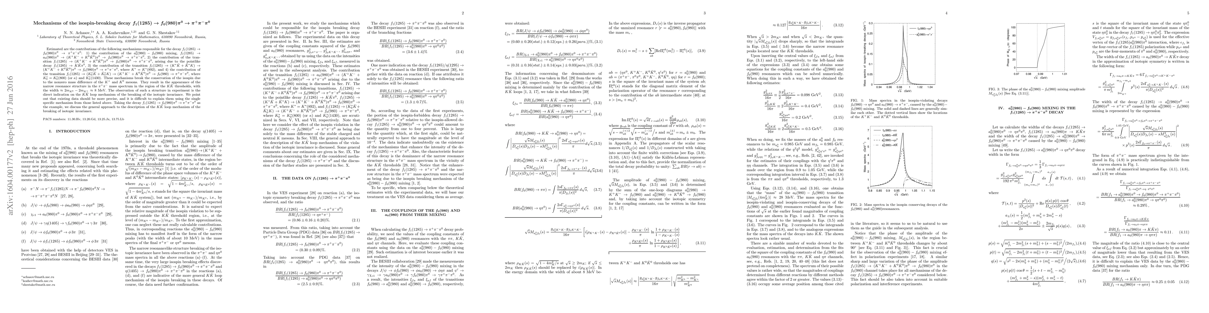 Estimated are the contributions of the following mechanisms responsible for the decay $f_1(1285)\to f_0(980)\pi^0\to\pi^+\pi^-\pi^0$: 1) the contribution of the $a^0_0(980)-f_0(980)$ mixing, $f_1(1285)\to a_0(980)\pi^0\to (K^+K^-+K^0\bar K^0)\pi^0\to f_0(980)\pi^0\to\pi^+\pi^-\pi^0$, 2) the contribution of the transition $f_1(1285)\to(K^+K^-+K^0\bar K^0)\pi^0\to f_0 (980)\pi^0\to\pi^+\pi^-\pi^0$, arising due to the pointlike decay $f_1 (1285)\to K\bar K\pi^0$, 3) the contribution of the transition $f_1(1285)\to(K^*\bar K+\bar K^*K)\to(K^+K^-+K^0\bar K^0)\pi^0\to f_0(980)\pi^0\to \pi^+\pi^-\pi^0$, where $K^*=K^*(892)$, and 4) the contribution of the transition $f_1(1285)\to(K^*_0\bar K+\bar K^*_0K)\to(K^+K^-+K^0\bar K^0)\pi^0\to f_0(980)\to\pi^+ \pi^-\pi^0$, where $K^*_0=K^*_0(800)$ (or $\kappa$) and $K^*_0(1430)$. These mechanisms break the conservation of the isospin due to the nonzero mass difference of the $K^+$ and $K^0$ mesons. They result in the appearance of the narrow resonance structure in the $\pi^+\pi^-$ mass spectrum in the region of the $K\bar K$ thresholds, with the width $\approx2m_{K^0}-2m_{K^+}\approx8$ MeV. The observation of such a structure in experiment is the direct indication on the $K\bar K$ loop mechanism of the breaking of the isotopic invariance. We point out that existing data should be more precise, and it is difficult to explain them using the single specific mechanism from those listed above. Taking the decay $f_1(1285)\to f_0(980)\pi^0 \to\pi^+\pi^-\pi^0$ as the example, we discuss the general approach to the description of the $K\bar K$ loop mechanism of the breaking of isotopic invariance.