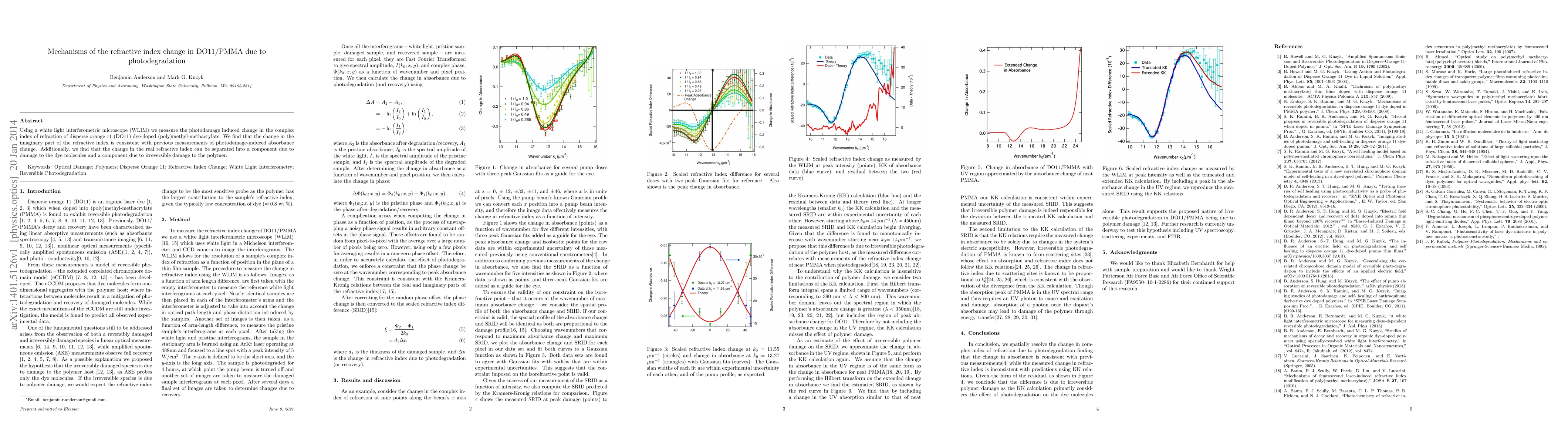 Using a white light interferometric microscope (WLIM) we measure the photodamage induced change in the complex index of refraction of disperse orange 11 (DO11) dye-doped (poly)methyl-methacrylate. We find that the change in the imaginary part of the refractive index is consistent with previous measurements of photodamage-induced absorbance change. Additionally, we find that the change in the real refractive index can be separated into a component due to damage to the dye molecules and a component due to irreversible damage to the polymer.