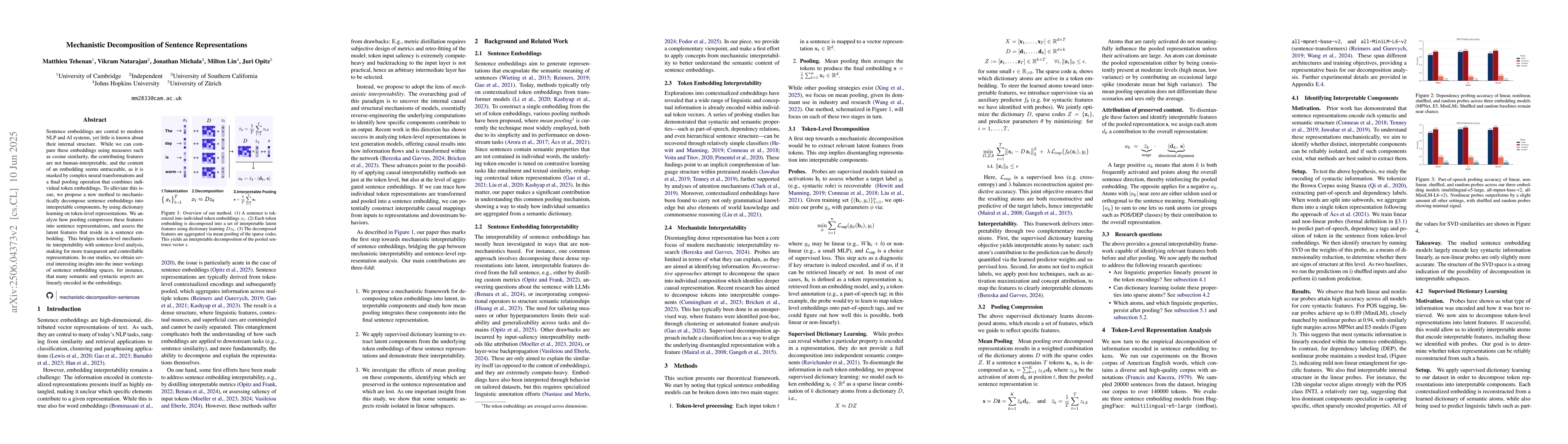 This work bridges token-level mechanistic interpretability with sentence-level analysis, offering new insights into the internal structure of sentence embeddings.