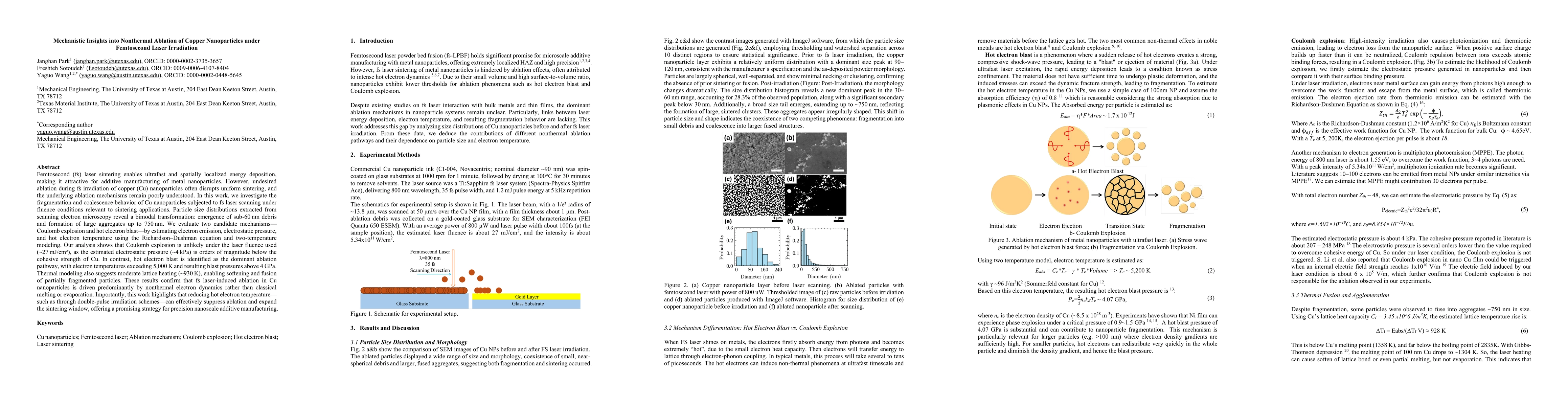 This research identifies nonthermal electron dynamics as the primary driver of femtosecond laser-induced ablation in copper nanoparticles, rather than classical melting or evaporation. It suggests strategies like double-pulse irradiation to reduce hot electron temperature and suppress ablation, advancing precision nanoscale additive manufacturing.