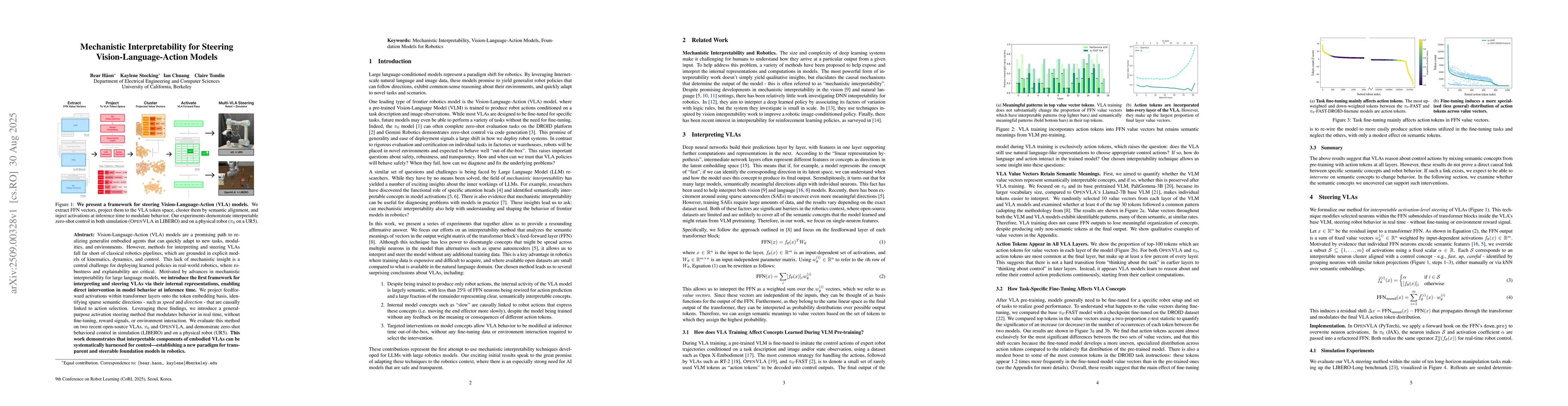 Vision-Language-Action (VLA) models are a promising path to realizing generalist embodied agents that can quickly adapt to new tasks, modalities, and environments. However, methods for interpreting and steering VLAs fall far short of classical robotics pipelines, which are grounded in explicit models of kinematics, dynamics, and control. This lack of mechanistic insight is a central challenge for deploying learned policies in real-world robotics, where robustness and explainability are critical. Motivated by advances in mechanistic interpretability for large language models, we introduce the first framework for interpreting and steering VLAs via their internal representations, enabling direct intervention in model behavior at inference time. We project feedforward activations within transformer layers onto the token embedding basis, identifying sparse semantic directions - such as speed and direction - that are causally linked to action selection. Leveraging these findings, we introduce a general-purpose activation steering method that modulates behavior in real time, without fine-tuning, reward signals, or environment interaction. We evaluate this method on two recent open-source VLAs, Pi0 and OpenVLA, and demonstrate zero-shot behavioral control in simulation (LIBERO) and on a physical robot (UR5). This work demonstrates that interpretable components of embodied VLAs can be systematically harnessed for control - establishing a new paradigm for transparent and steerable foundation models in robotics.