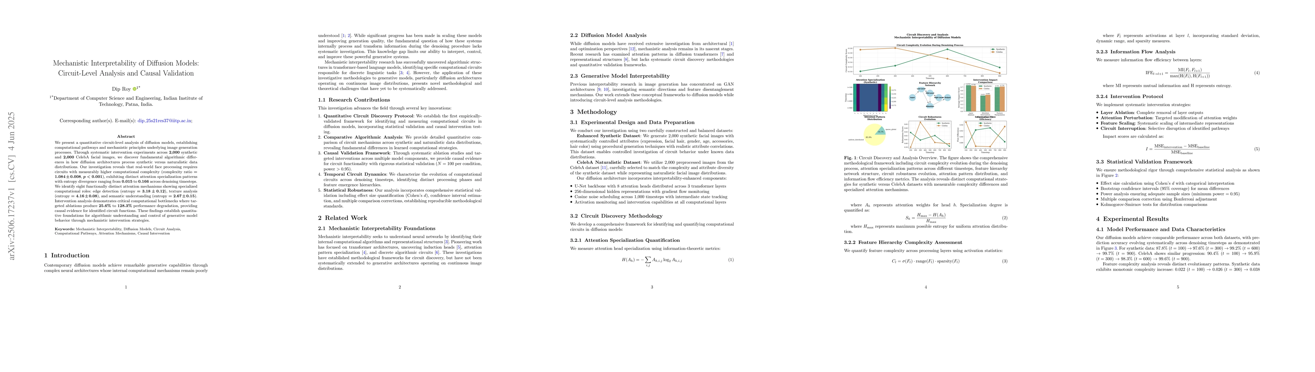 We present a quantitative circuit-level analysis of diffusion models, establishing computational pathways and mechanistic principles underlying image generation processes. Through systematic intervention experiments across 2,000 synthetic and 2,000 CelebA facial images, we discover fundamental algorithmic differences in how diffusion architectures process synthetic versus naturalistic data distributions. Our investigation reveals that real-world face processing requires circuits with measurably higher computational complexity (complexity ratio = 1.084 plus/minus 0.008, p < 0.001), exhibiting distinct attention specialization patterns with entropy divergence ranging from 0.015 to 0.166 across denoising timesteps. We identify eight functionally distinct attention mechanisms showing specialized computational roles: edge detection (entropy = 3.18 plus/minus 0.12), texture analysis (entropy = 4.16 plus/minus 0.08), and semantic understanding (entropy = 2.67 plus/minus 0.15). Intervention analysis demonstrates critical computational bottlenecks where targeted ablations produce 25.6% to 128.3% performance degradation, providing causal evidence for identified circuit functions. These findings establish quantitative foundations for algorithmic understanding and control of generative model behavior through mechanistic intervention strategies.