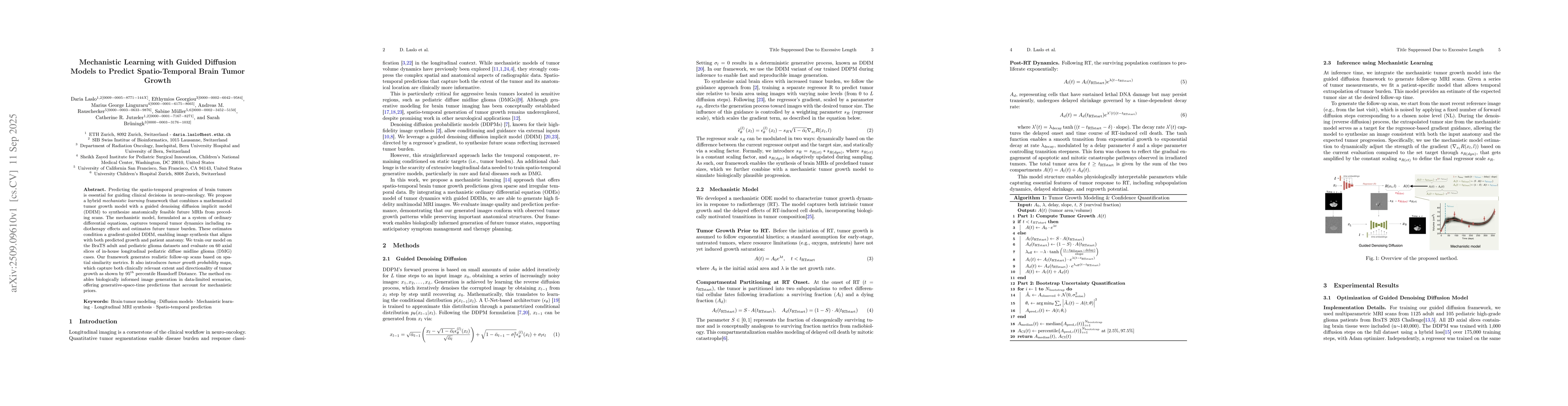 Predicting the spatio-temporal progression of brain tumors is essential for guiding clinical decisions in neuro-oncology. We propose a hybrid mechanistic learning framework that combines a mathematical tumor growth model with a guided denoising diffusion implicit model (DDIM) to synthesize anatomically feasible future MRIs from preceding scans. The mechanistic model, formulated as a system of ordinary differential equations, captures temporal tumor dynamics including radiotherapy effects and estimates future tumor burden. These estimates condition a gradient-guided DDIM, enabling image synthesis that aligns with both predicted growth and patient anatomy. We train our model on the BraTS adult and pediatric glioma datasets and evaluate on 60 axial slices of in-house longitudinal pediatric diffuse midline glioma (DMG) cases. Our framework generates realistic follow-up scans based on spatial similarity metrics. It also introduces tumor growth probability maps, which capture both clinically relevant extent and directionality of tumor growth as shown by 95th percentile Hausdorff Distance. The method enables biologically informed image generation in data-limited scenarios, offering generative-space-time predictions that account for mechanistic priors.
