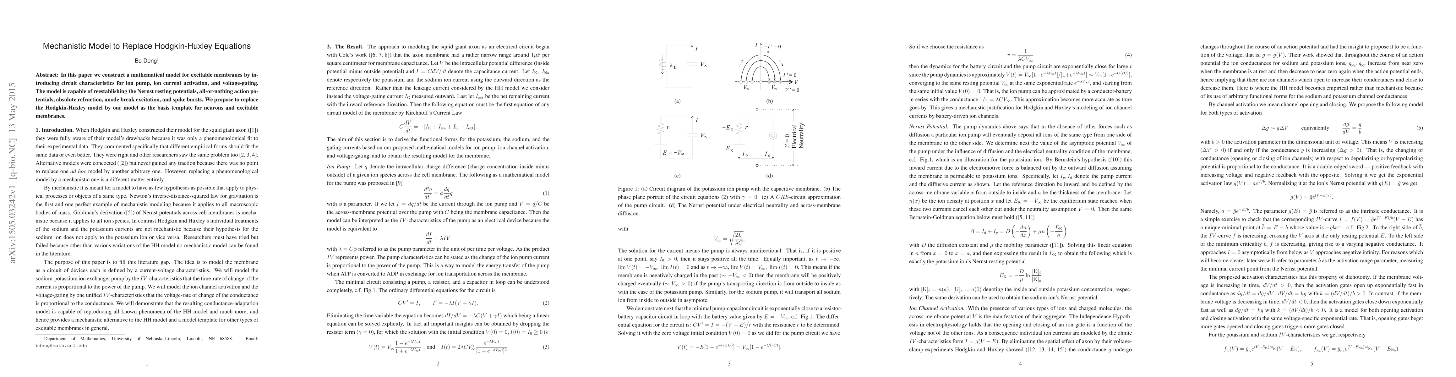 The paper constructs a mathematical model for excitable membranes by introducing circuit characteristics for ion pump, ion current activation, and voltage-gating, aiming to replace the Hodgkin-Huxley equations.