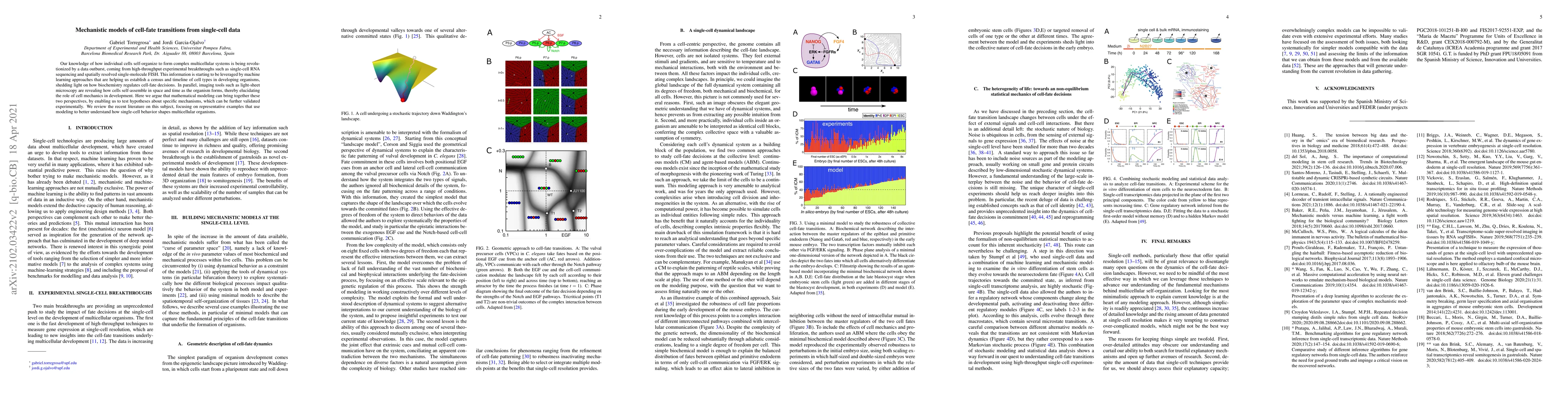 The paper reviews recent literature on mechanistic models of cell-fate transitions from single-cell data, integrating high-throughput experimental data with mathematical modeling and imaging tools.
