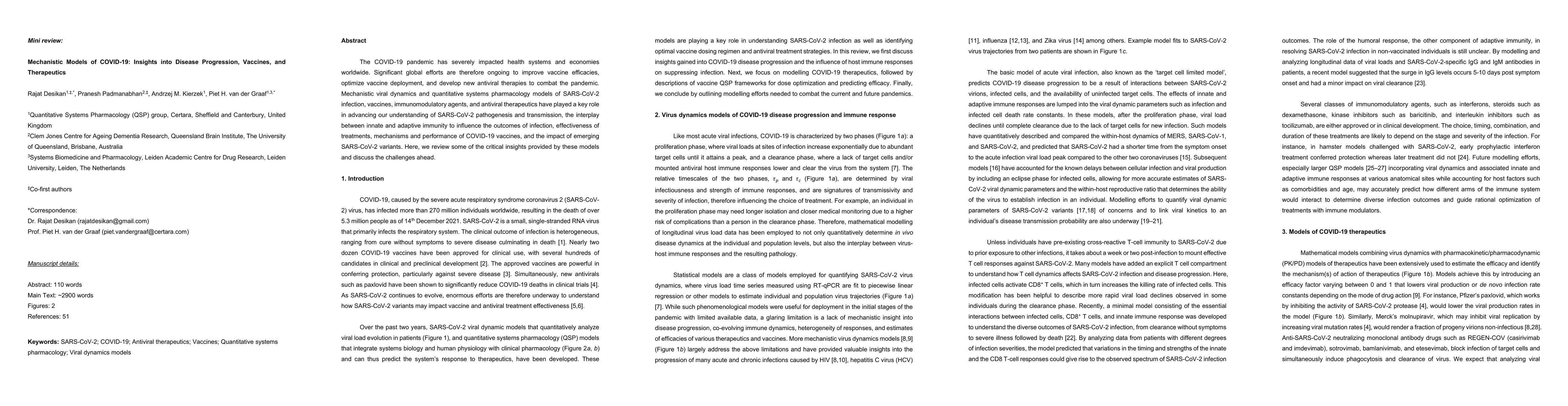 The COVID-19 pandemic has severely impacted health systems and economies worldwide. Significant global efforts are therefore ongoing to improve vaccine efficacies, optimize vaccine deployment, and develop new antiviral therapies to combat the pandemic. Mechanistic viral dynamics and quantitative systems pharmacology models of SARS-CoV-2 infection, vaccines, immunomodulatory agents, and antiviral therapeutics have played a key role in advancing our understanding of SARS-CoV-2 pathogenesis and transmission, the interplay between innate and adaptive immunity to influence the outcomes of infection, effectiveness of treatments, mechanisms and performance of COVID-19 vaccines, and the impact of emerging SARS-CoV-2 variants. Here, we review some of the critical insights provided by these models and discuss the challenges ahead.