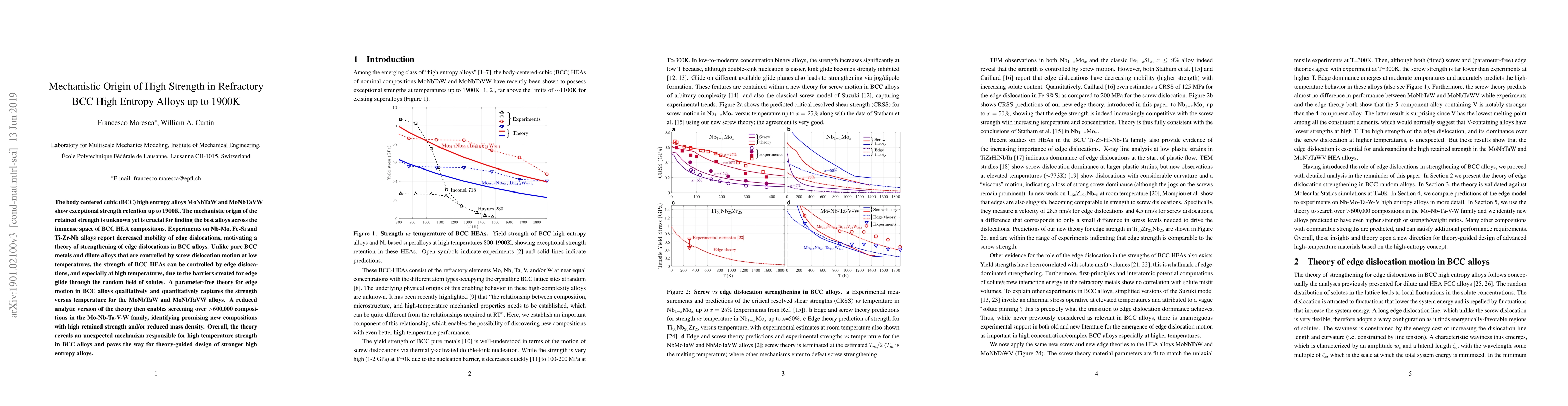 This paper investigates the exceptional strength retention of BCC high entropy alloys (MoNbTaW and MoNbTaVW) up to 1900K, attributing it to the decreased mobility of edge dislocations due to solute barriers. The developed theory enables screening of over 600,000 compositions, identifying new alloys with high retained strength and lower density.