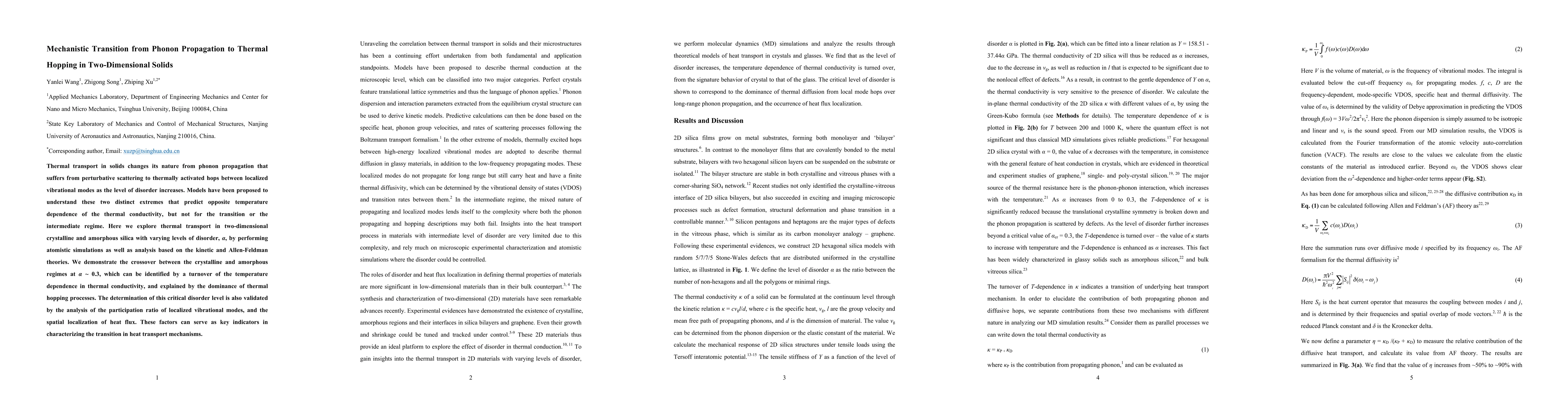 This paper investigates the transition in thermal transport mechanisms in two-dimensional solids from phonon propagation to thermal hopping due to increasing disorder. The study identifies a critical disorder level (~0.3) where the thermal conductivity's temperature dependence changes, indicating the dominance of thermal hopping.