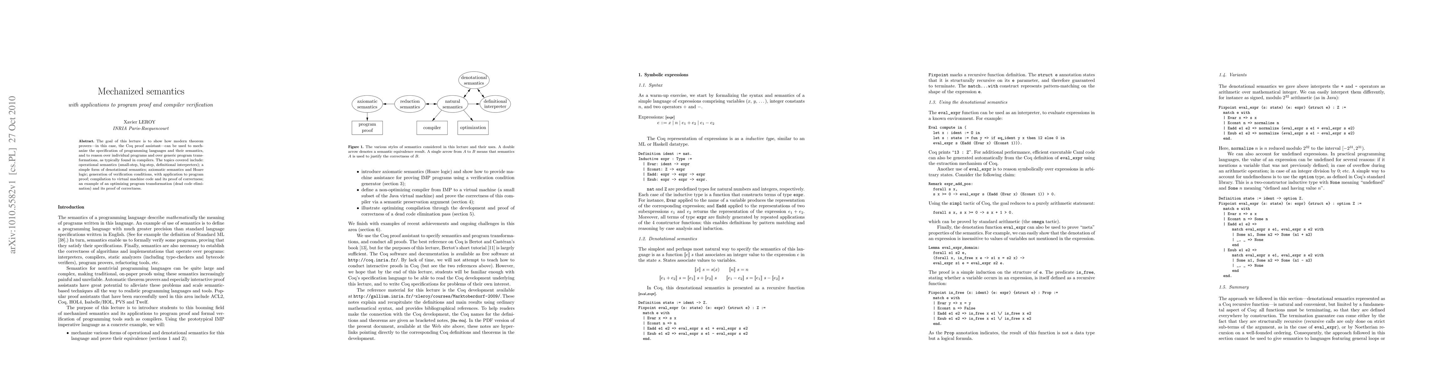 The goal of this lecture is to show how modern theorem provers---in this case, the Coq proof assistant---can be used to mechanize the specification of programming languages and their semantics, and to reason over individual programs and over generic program transformations, as typically found in compilers. The topics covered include: operational semantics (small-step, big-step, definitional interpreters); a simple form of denotational semantics; axiomatic semantics and Hoare logic; generation of verification conditions, with application to program proof; compilation to virtual machine code and its proof of correctness; an example of an optimizing program transformation (dead code elimination) and its proof of correctness.