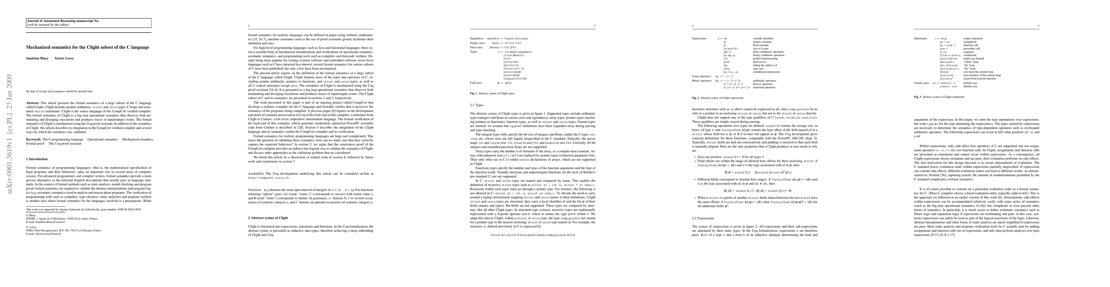This paper formalizes the semantics of Clight, a subset of C language, using Coq, and integrates it into the CompCert verified compiler, validating the semantics through various methods. The formalization covers pointer arithmetic, structs, unions, loops, and switch statements.