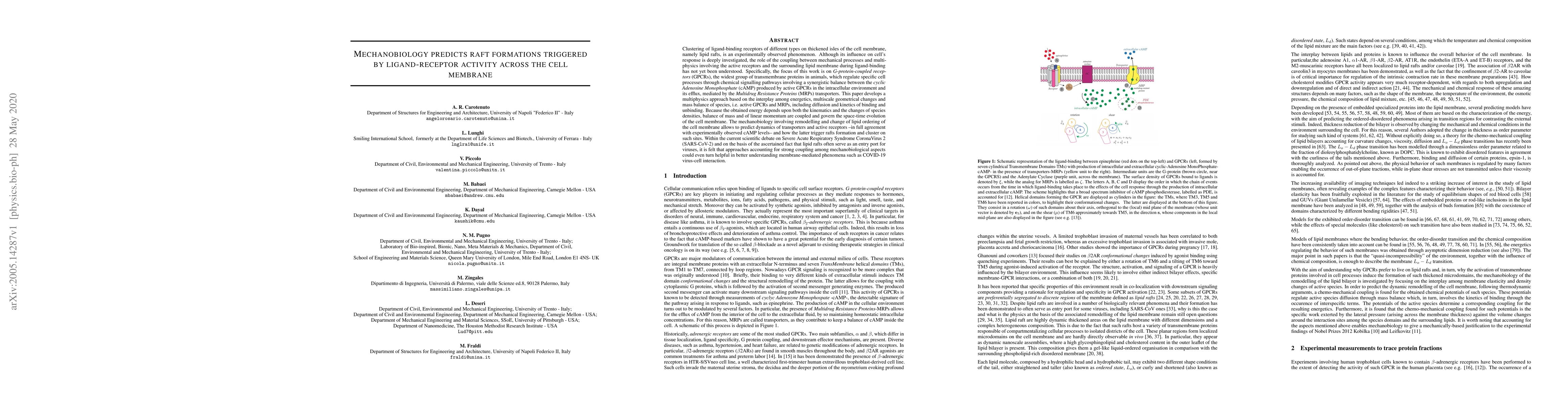 Clustering of ligand-binding receptors of different types on thickened isles of the cell membrane, namely lipid rafts, is an experimentally observed phenomenon. Although its influence on cell response is deeply investigated, the role of the coupling between mechanical processes and multiphysics involving the active receptors and the surrounding lipid membrane during ligand-binding has not yet been understood. Specifically, the focus of this work is on G-protein-coupled receptors (GPCRs), which regulate specific cell processes through chemical signalling pathways involving a synergistic balance between the cyclic Adenosine Monophosphate (cAMP) produced by active GPCRs in the intracellular environment and its efflux, mediated by Multidrug Resistance Proteins (MRPs) transporters. This paper develops a multiphysics approach based on the interplay among energetics, multiscale geometrical changes and mass balance of species, i.e. active GPCRs and MRPs, including diffusion and kinetics of binding and unbinding. Because the obtained energy depends upon both the kinematics and the changes of species densities, balance of mass and of linear momentum are coupled and govern the space-time evolution of the cell membrane. The mechanobiology involving remodelling and change of lipid ordering of the cell membrane allows to predict dynamics of transporters and active receptors -in agreement with experimentally observed cAMP levels- and how the latter trigger rafts formation and cluster on such sites. Within the current scientific debate on Severe Acute Respiratory Syndrome CoronaVirus 2 (SARS-CoV-2) and on the basis of the ascertained fact that lipid rafts often serve as an entry port for viruses, it is felt that approaches accounting for strong coupling among mechanobiological aspects could even turn helpful in better understanding membrane-mediated phenomena such as COVID-19 virus-cell interaction.