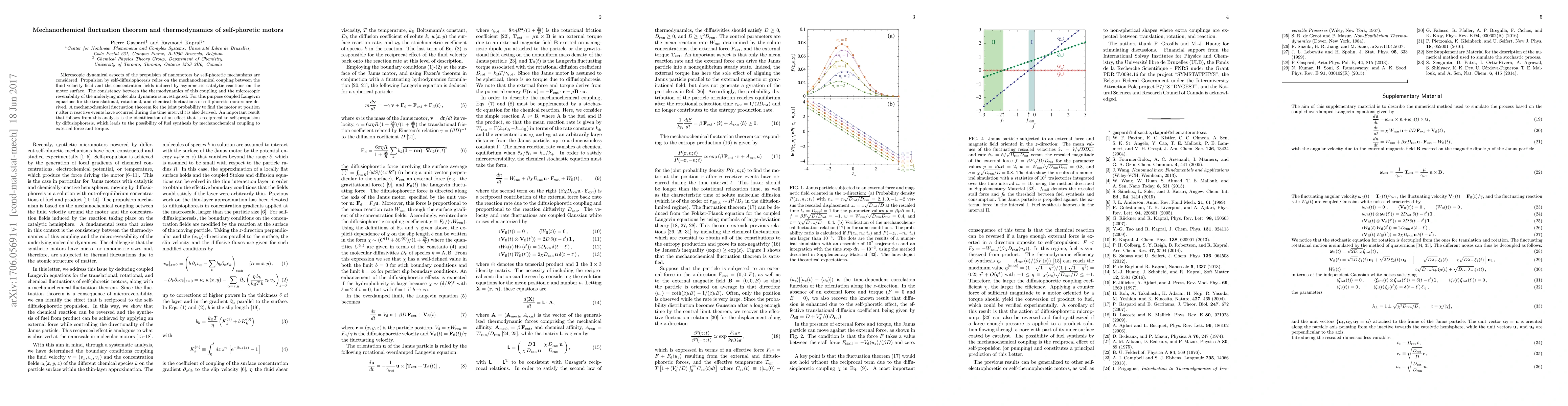 Microscopic dynamical aspects of the propulsion of nanomotors by self-phoretic mechanisms are considered. Propulsion by self-diffusiophoresis relies on the mechanochemical coupling between the fluid velocity field and the concentration fields induced by asymmetric catalytic reactions on the motor surface. The consistency between the thermodynamics of this coupling and the microscopic reversibility of the underlying molecular dynamics is investigated. For this purpose coupled Langevin equations for the translational, rotational, and chemical fluctuations of self-phoretic motors are derived. A mechanochemical fluctuation theorem for the joint probability to find the motor at position r after n reactive events have occurred during the time interval t is also derived. An important result that follows from this analysis is the identification of an effect that is reciprocal to self-propulsion by diffusiophoresis, which leads to the possibility of fuel synthesis by mechanochemical coupling to external force and torque.