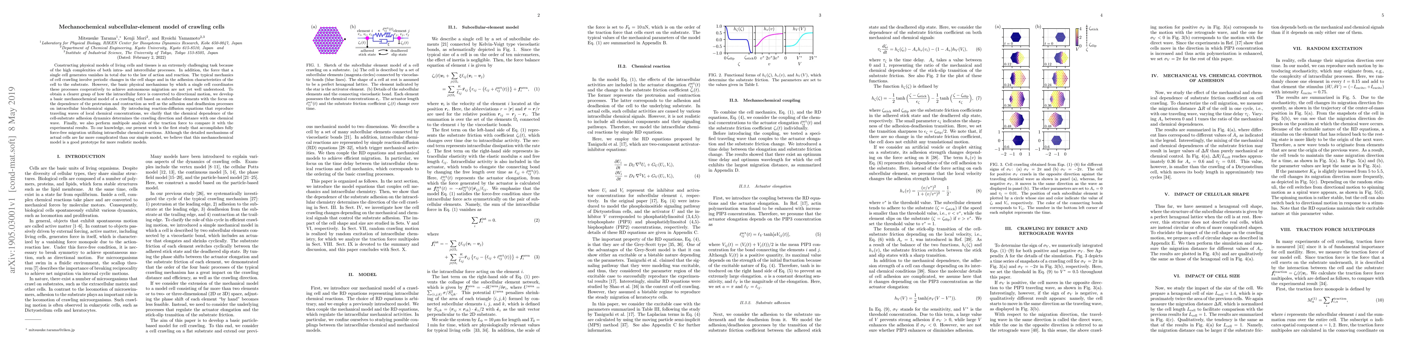 This paper develops a mechanochemical model of crawling cells to understand how intracellular forces translate into directional motion. The model uses subcellular elements and reaction-diffusion equations to simulate the coordination of protrusion, contraction, adhesion, and deadhesion processes driven by biochemical signals, achieving force-free migration.