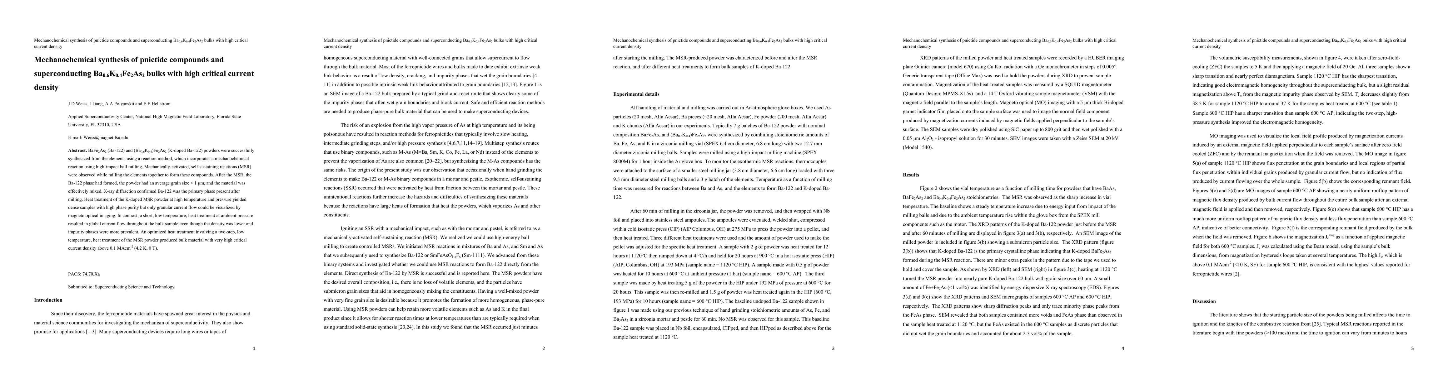 BaFe2As2 (Ba-122) and (Ba0.6K0.4)Fe2As2 (K-doped Ba-122) powders were successfully synthesized from the elements using a reaction method, which incorporates a mechanochemical reaction using high-impact ball milling. Mechanically-activated, self-sustaining reactions (MSR) were observed while milling the elements together to form these compounds. After the MSR, the Ba-122 phase had formed, the powder had an average grain size < 1 {\mu}m, and the material was effectively mixed. X-ray diffraction confirmed Ba-122 was the primary phase present after milling. Heat treatment of the K-doped MSR powder at high temperature and pressure yielded dense samples with high phase purity but only granular current flow could be visualized by magneto optical imaging. In contrast, a short, low temperature, heat treatment at ambient pressure resulted in global current flow throughout the bulk sample even though the density was lower and impurity phases were more prevalent. An optimized heat treatment involving a two-step, low temperature, heat treatment of the MSR powder produced bulk material with very high critical current density above 0.1 MAcm-2 (4.2 K, 0 T).