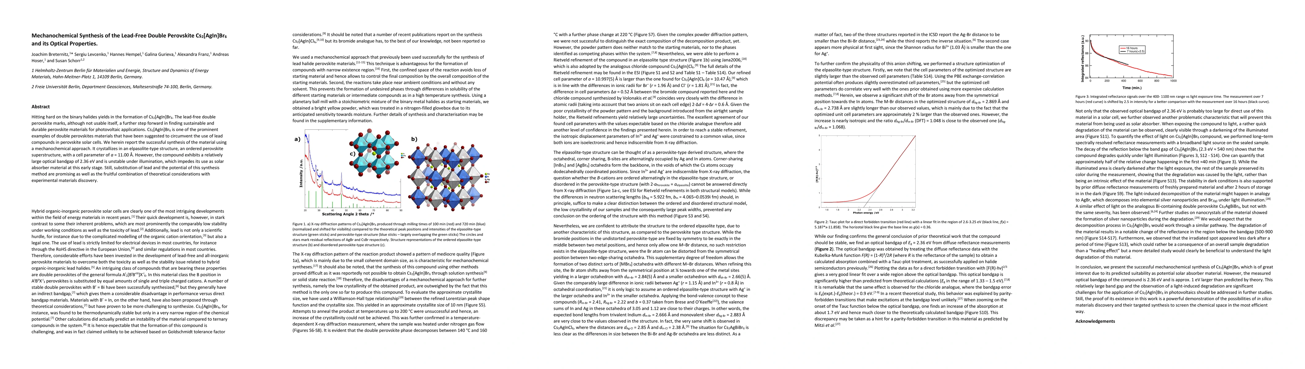 The paper presents a novel mechanochemical synthesis method for Cs2[AgIn]Br6, along with comprehensive structural and optical characterization using Rietveld refinement, neutron measurements, and DFT calculations.