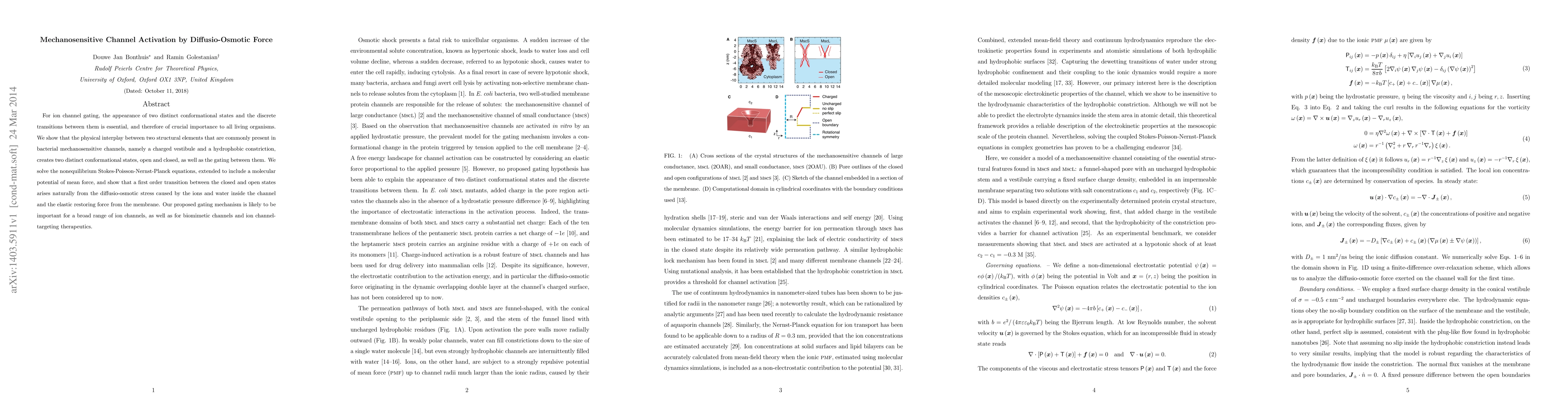For ion channel gating, the appearance of two distinct conformational states and the discrete transitions between them is essential, and therefore of crucial importance to all living organisms. We show that the physical interplay between two structural elements that are commonly present in bacterial mechanosensitive channels, namely a charged vestibule and a hydrophobic constriction, creates two distinct conformational states, open and closed, as well as the gating between them. We solve the nonequilibrium Stokes-Poisson-Nernst-Planck equations, extended to include a molecular potential of mean force, and show that a first order transition between the closed and open states arises naturally from the diffusio-osmotic stress caused by the ions and water inside the channel and the elastic restoring force from the membrane. Our proposed gating mechanism is likely to be important for a broad range of ion channels, as well as for biomimetic channels and ion channel-targeting therapeutics.