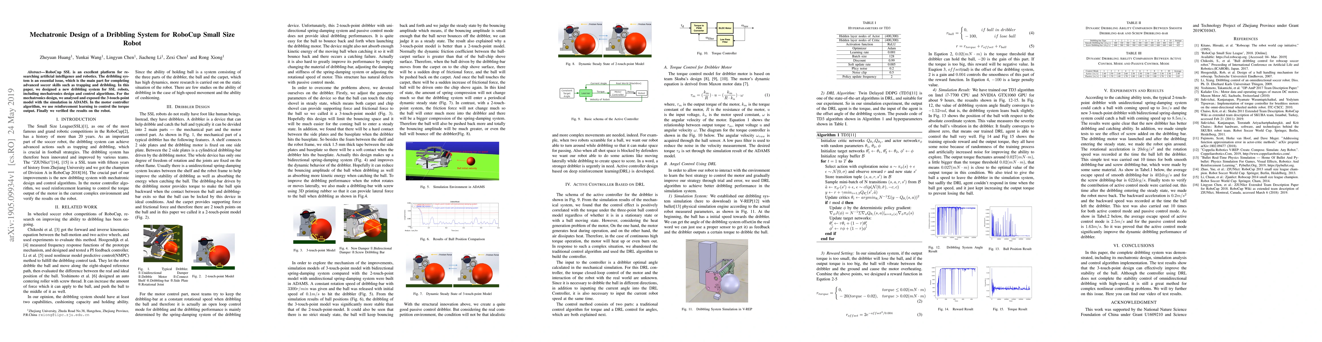 RoboCup SSL is an excellent platform for researching artificial intelligence and robotics. The dribbling system is an essential issue, which is the main part for completing advanced soccer skills such as trapping and dribbling. In this paper, we designed a new dribbling system for SSL robots, including mechatronics design and control algorithms. For the mechatronics design, we analysed and exposed the 3-touch-point model with the simulation in ADAMS. In the motor controller algorithm, we use reinforcement learning to control the torque output. Finally we verified the results on the robot.