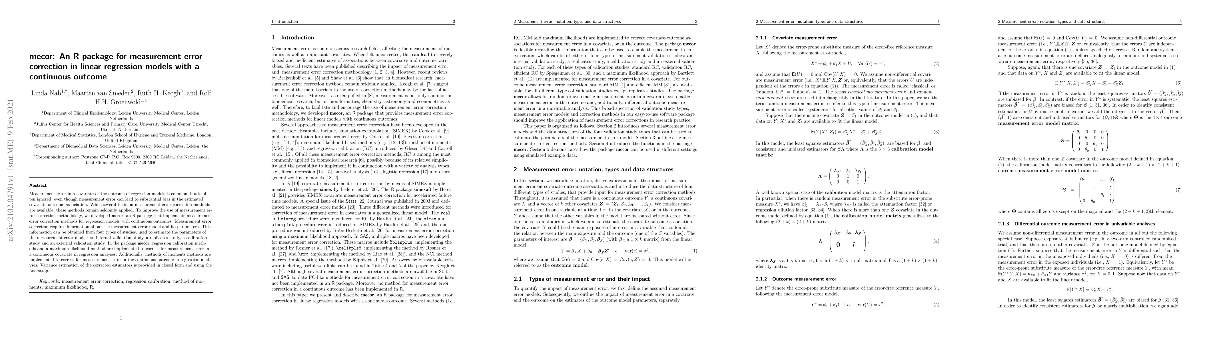 The mecor R package provides tools for correcting measurement error in linear regression models with continuous outcomes, implementing various methods including regression calibration, maximum likelihood, and methods of moments. It supports estimation of measurement error parameters from different study types and offers variance estimation techniques.