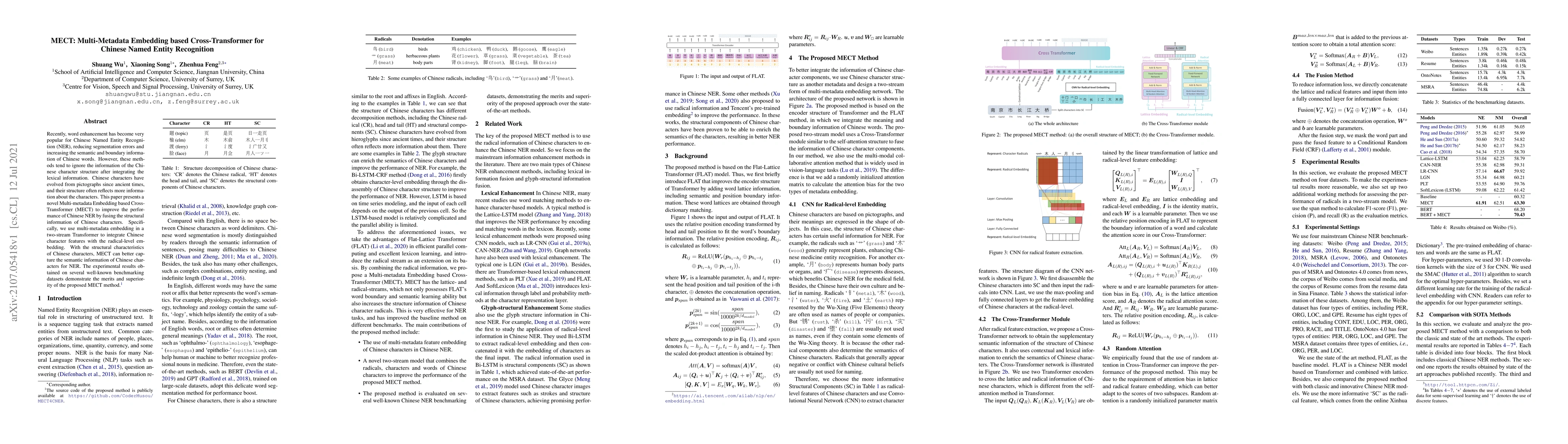 This paper introduces MECT, a Multi-metadata Embedding based Cross-Transformer for enhancing Chinese Named Entity Recognition (NER) by integrating structural information of Chinese characters. MECT employs a two-stream Transformer to fuse character features with radical-level embeddings, achieving superior performance over existing methods.
