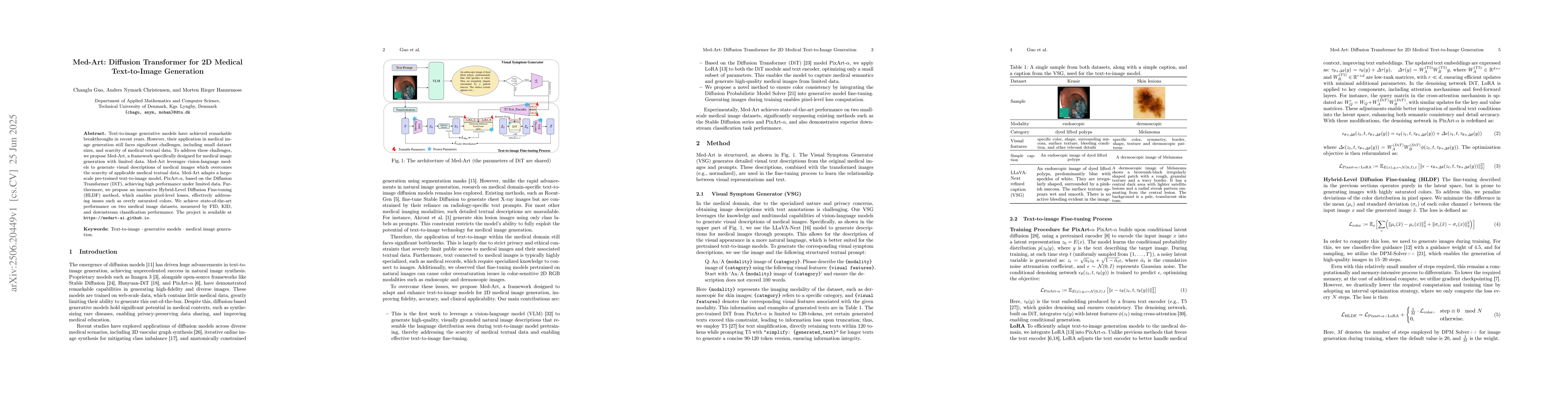 Text-to-image generative models have achieved remarkable breakthroughs in recent years. However, their application in medical image generation still faces significant challenges, including small dataset sizes, and scarcity of medical textual data. To address these challenges, we propose Med-Art, a framework specifically designed for medical image generation with limited data. Med-Art leverages vision-language models to generate visual descriptions of medical images which overcomes the scarcity of applicable medical textual data. Med-Art adapts a large-scale pre-trained text-to-image model, PixArt-$\alpha$, based on the Diffusion Transformer (DiT), achieving high performance under limited data. Furthermore, we propose an innovative Hybrid-Level Diffusion Fine-tuning (HLDF) method, which enables pixel-level losses, effectively addressing issues such as overly saturated colors. We achieve state-of-the-art performance on two medical image datasets, measured by FID, KID, and downstream classification performance.