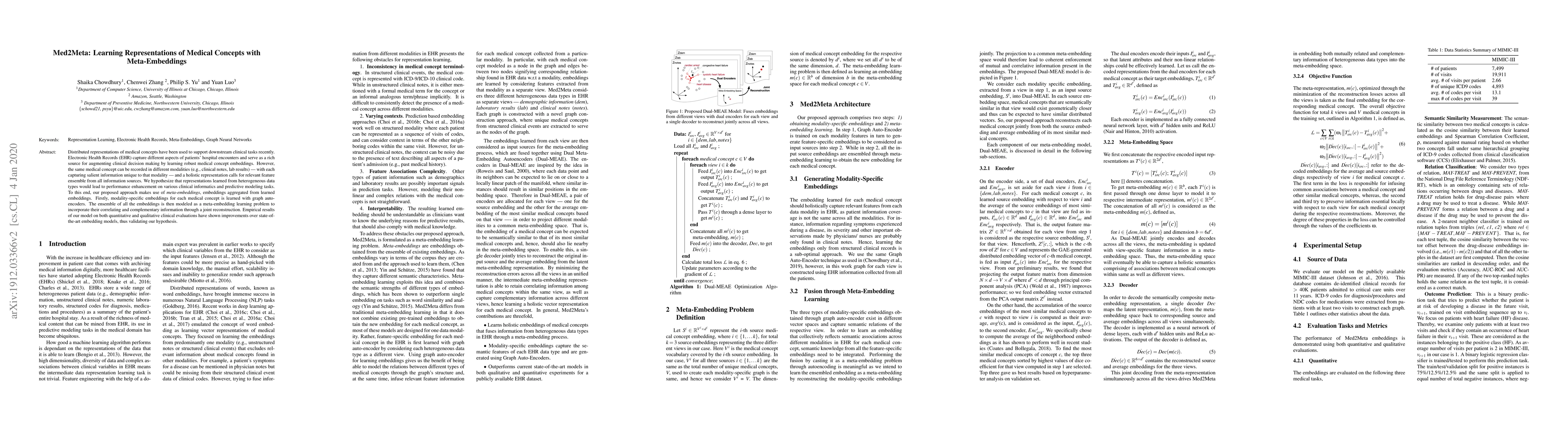 The paper proposes Med2Meta, a method for learning robust representations of medical concepts using meta-embeddings that aggregate modality-specific embeddings from diverse data sources like clinical notes and lab results. The approach demonstrates improved performance on clinical informatics tasks compared to existing models.