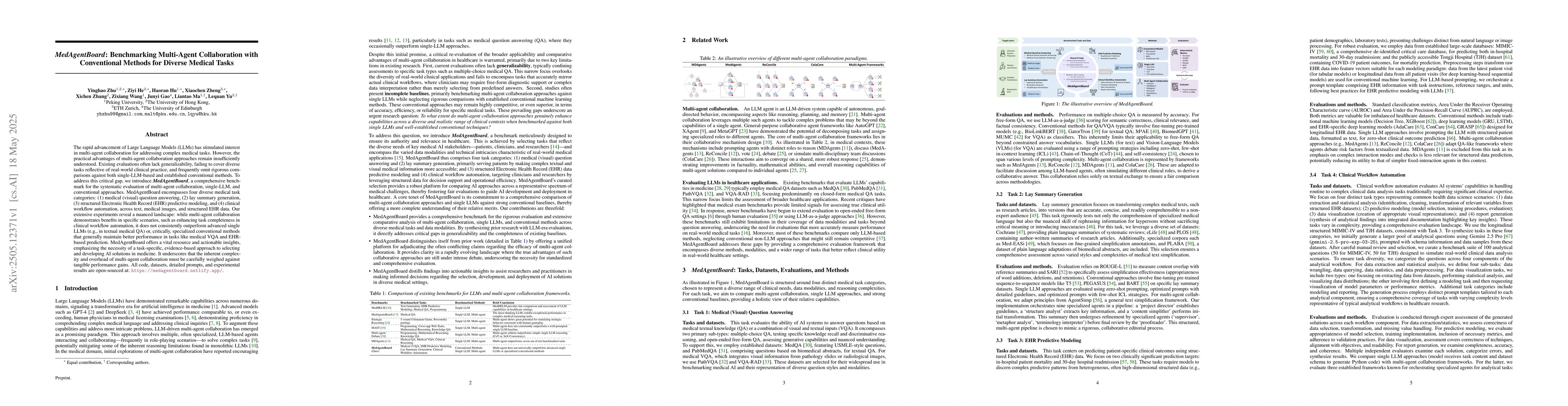 MedAgentBoard, an extensive benchmark for evaluating multi-agent collaboration, single-LLM, and conventional methods in diverse medical tasks, along with open-sourced code, datasets, and experimental results.