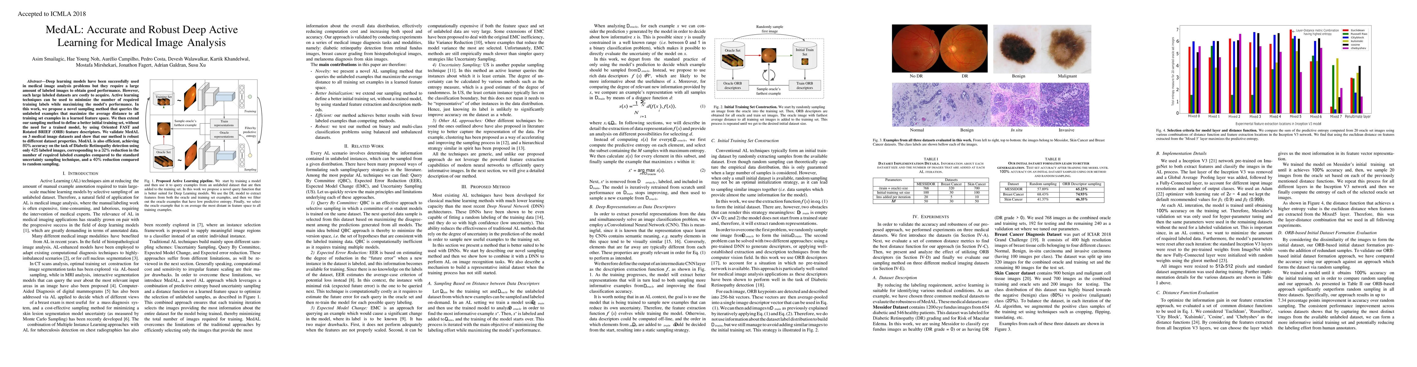 MedAL is a novel deep active learning sampling method designed to minimize the number of labeled images required for training deep learning models in medical image analysis, achieving high accuracy with significantly fewer labeled examples. The method queries unlabeled examples based on their average distance in a learned feature space, demonstrating robust performance across various medical datasets.