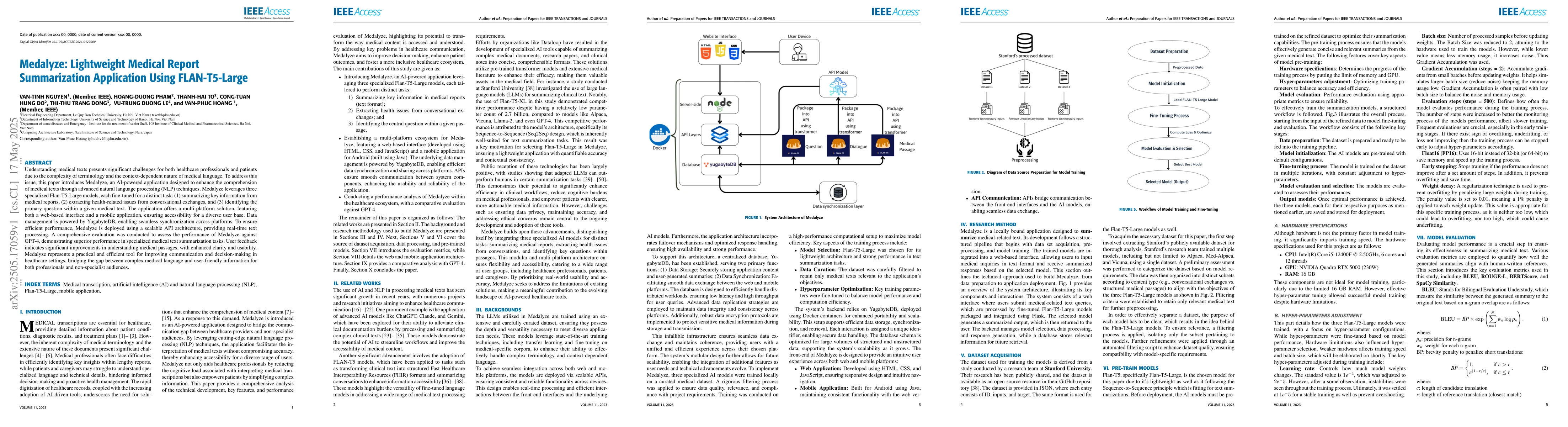 The paper introduces Medalyze, an AI application using three specialized FLAN-T5-Large models fine-tuned for summarizing medical reports, extracting health issues from patient-doctor conversations, and identifying key questions in passages.