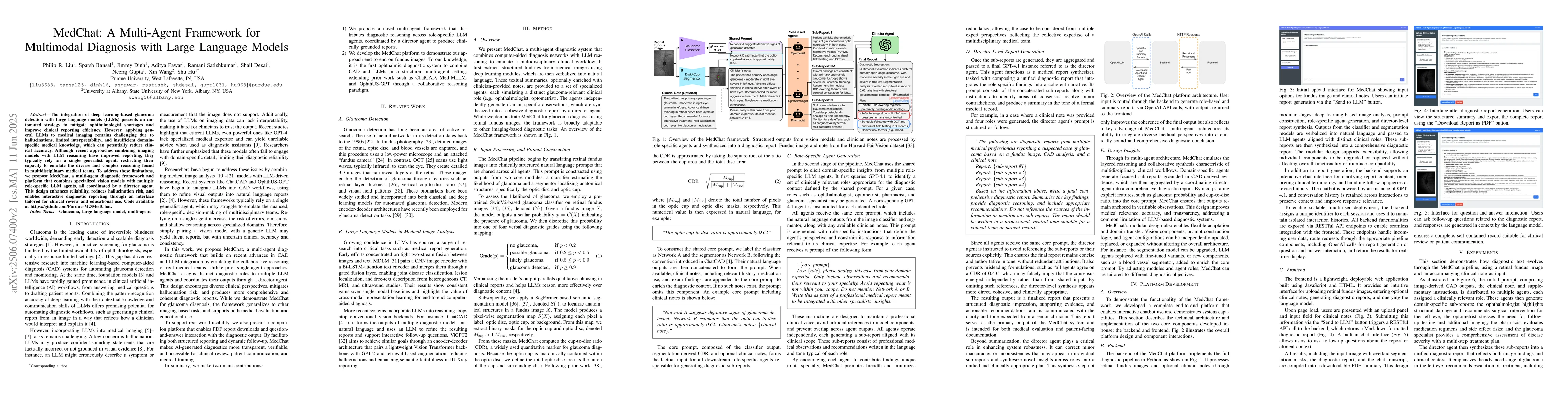 Researchers propose MedChat, a multi-agent framework combining specialized vision models with multiple LLM agents to improve glaucoma detection accuracy and clinical reporting efficiency. This design enhances reliability and reduces hallucination risk, enabling interactive diagnostic reporting.