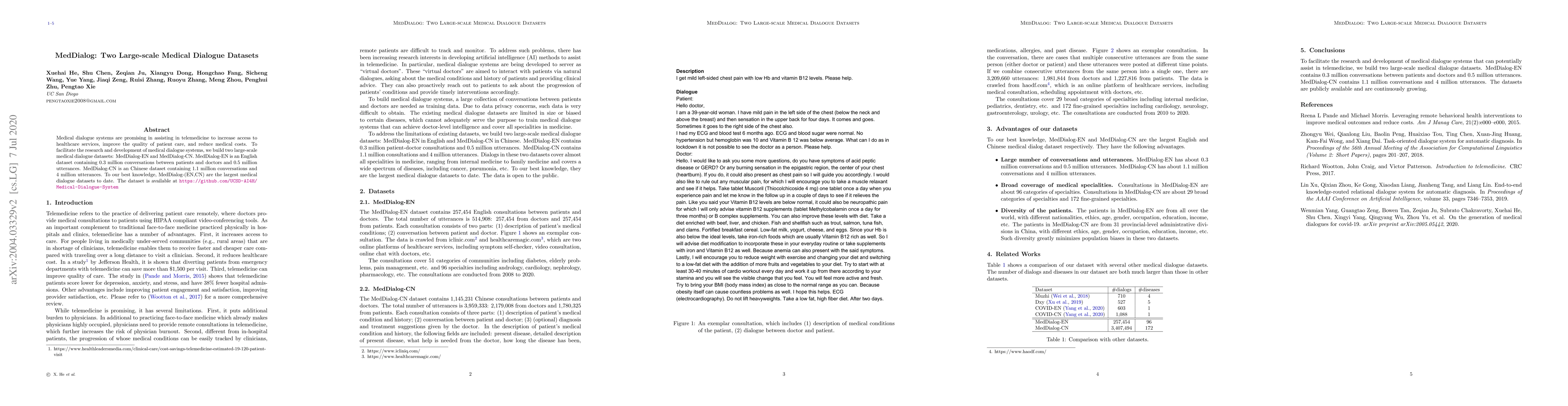 Researchers created two large-scale medical dialogue datasets, MedDialog-EN and MedDialog-CN, to support development of telemedicine systems, with 0.3 million English conversations and 1.1 million Chinese conversations.