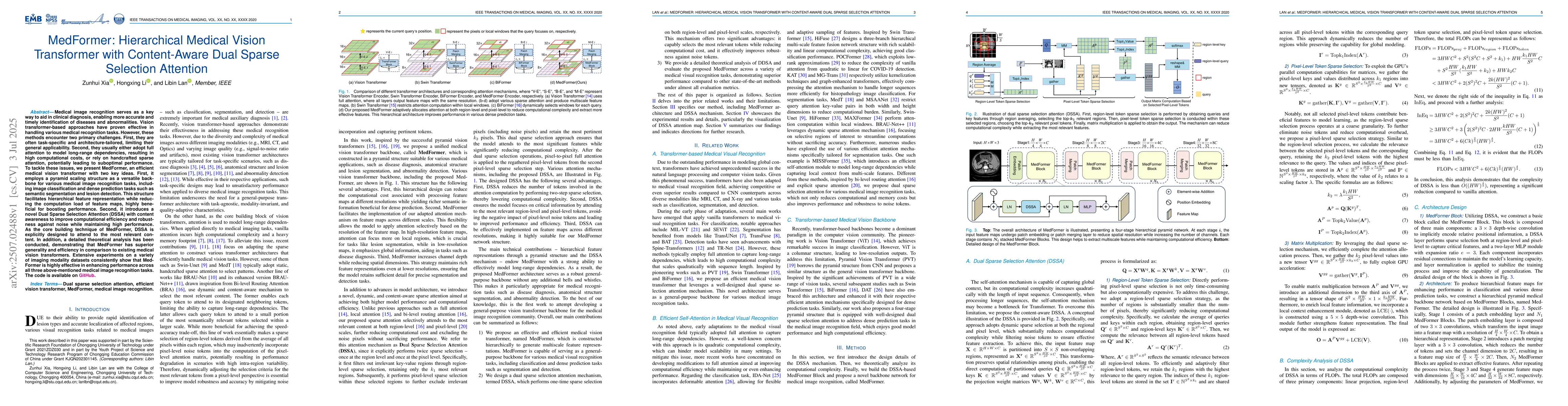 MedFormer differentiates itself by combining a hierarchical transformer architecture with a content-aware dual sparse selection attention mechanism, addressing the limitations of existing task-specific and computationally expensive medical vision transformers.