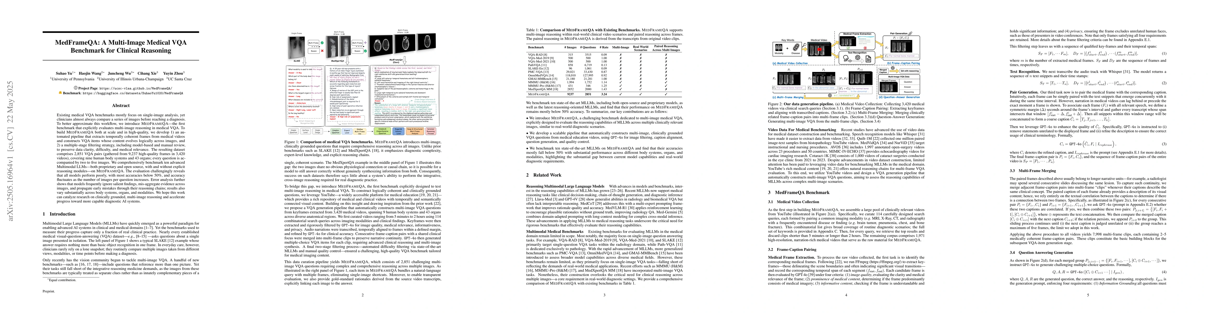 The research introduces MedFrameQA, a multi-image medical Visual Question Answering (VQA) benchmark, constructed using an automated pipeline for extracting temporally coherent frames from medical videos and a multiple-stage filtering strategy to ensure data quality and relevance. This dataset includes 2,851 VQA pairs from 9,237 high-quality frames across 3,420 videos, covering nine body systems and 43 organs.
