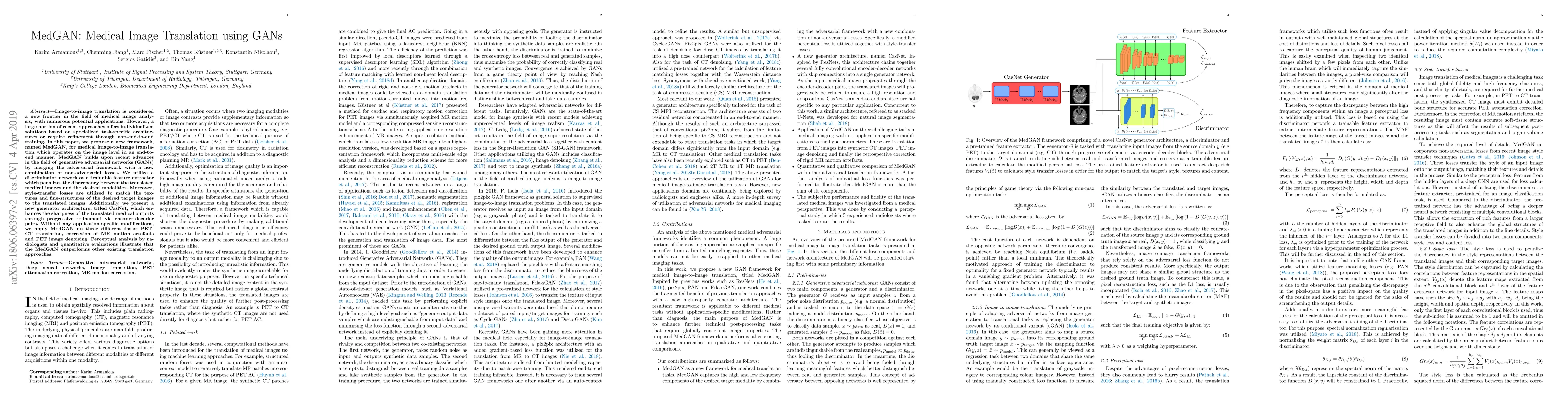 MedGAN introduces a new combination of non-adversarial losses (perceptual and style-content losses) on top of an adversarial framework, along with a CasNet generator architecture that progressively refines translated images via encoder-decoder pairs in an end-to-end manner.