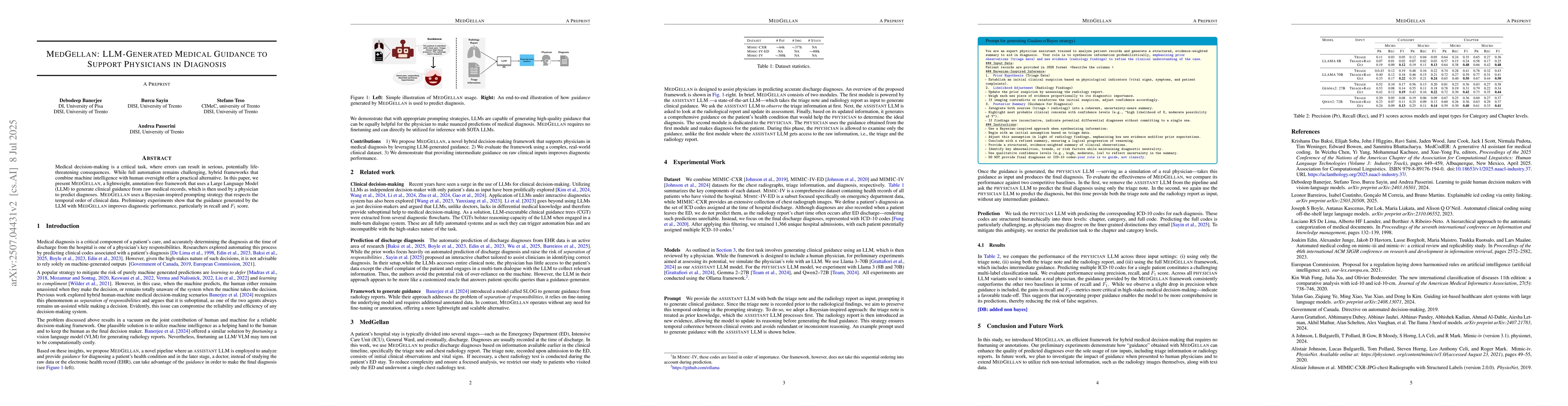 Medical decision-making is a critical task, where errors can result in serious, potentially life-threatening consequences. While full automation remains challenging, hybrid frameworks that combine machine intelligence with human oversight offer a practical alternative. In this paper, we present MedGellan, a lightweight, annotation-free framework that uses a Large Language Model (LLM) to generate clinical guidance from raw medical records, which is then used by a physician to predict diagnoses. MedGellan uses a Bayesian-inspired prompting strategy that respects the temporal order of clinical data. Preliminary experiments show that the guidance generated by the LLM with MedGellan improves diagnostic performance, particularly in recall and $F_1$ score.