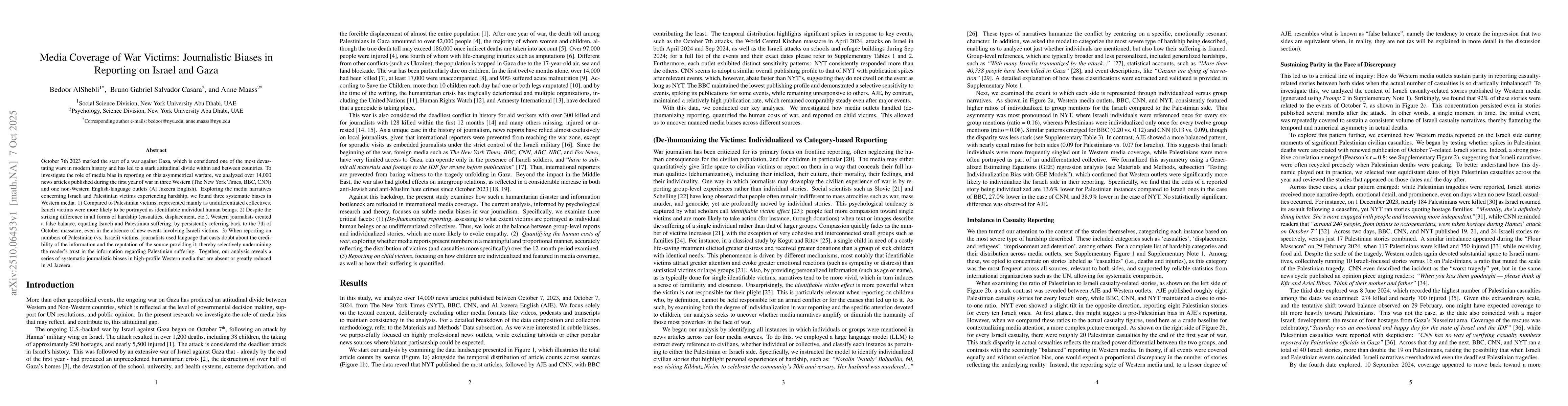 October 7th 2023 marked the start of a war against Gaza, which is considered one of the most devastating wars in modern history and has led to a stark attitudinal divide within and between countries. To investigate the role of media bias in reporting on this asymmetrical warfare, we analyzed over 14,000 news articles published during the first year of war in three Western (The New York Times, BBC, CNN) and one non-Western English-language outlets (Al Jazeera English). Exploring the media narratives concerning Israeli and Palestinian victims experiencing hardship, we found three systematic biases in Western media. 1) Compared to Palestinian victims, represented mainly as undifferentiated collectives, Israeli victims were more likely to be portrayed as identifiable individual human beings. 2) Despite the striking difference in all forms of hardship (casualties, displacement, etc.), Western journalists created a false balance, equating Israeli and Palestinian suffering, by persistently referring back to the 7th of October massacre, even in the absence of new events involving Israeli victims. 3) When reporting on numbers of Palestinian (vs. Israeli) victims, journalists used language that casts doubt about the credibility of the information and the reputation of the source providing it, thereby selectively undermining the reader's trust in the information regarding Palestinian suffering. Together, our analysis reveals a series of systematic journalistic biases in high-profile Western media that are absent or greatly reduced in Al Jazeera.