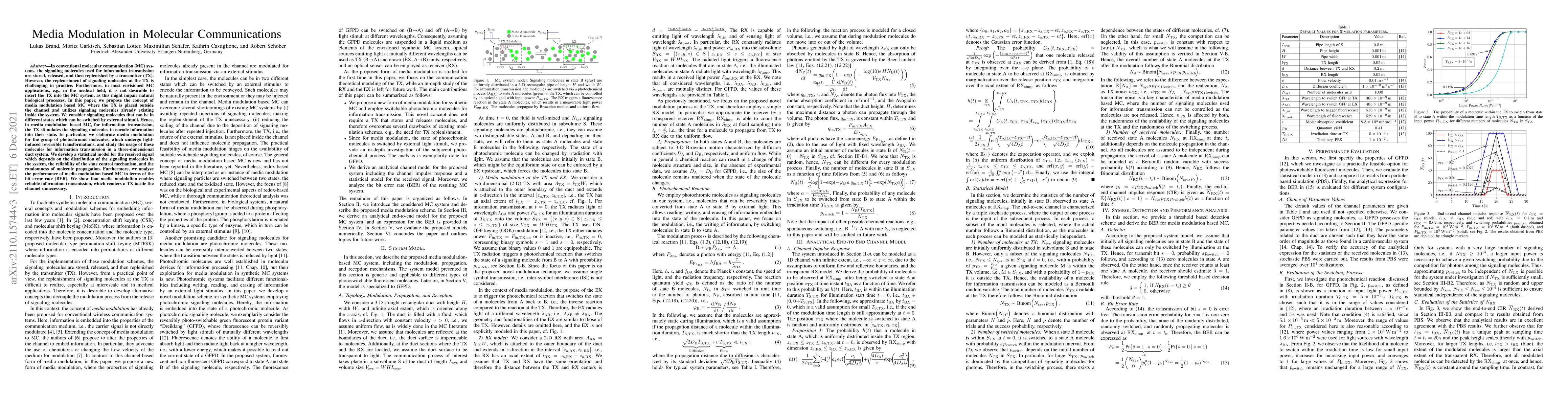 In conventional molecular communication (MC) systems, the signaling molecules used for information transmission are stored, released, and then replenished by a transmitter (TX). However, the replenishment of signaling molecules at the TX is challenging in practice. Furthermore, in most envisioned MC applications, e.g., in the medical field, it is not desirable to insert the TX into the MC system, as this might impair natural biological processes. In this paper, we propose the concept of media modulation based MC where the TX is placed outside the channel and utilizes signaling molecules already existing inside the system. We consider signaling molecules that can be in different states which can be switched by external stimuli. Hence, in media modulation based MC, for information transmission, the TX stimulates the signaling molecules to encode information into their state. In particular, we elaborate media modulation for the group of photochromic molecules, which undergo light-induced reversible transformations, and study the usage of these molecules for information transmission in a three-dimensional duct system. We develop a statistical model for the received signal which depends on the distribution of the signaling molecules in the system, the reliability of the state control mechanism, and the randomness of molecule propagation. Furthermore, we analyze the performance of media modulation based MC in terms of the bit error rate (BER). We show that media modulation enables reliable information transmission, which renders a TX inside the channel unnecessary.
