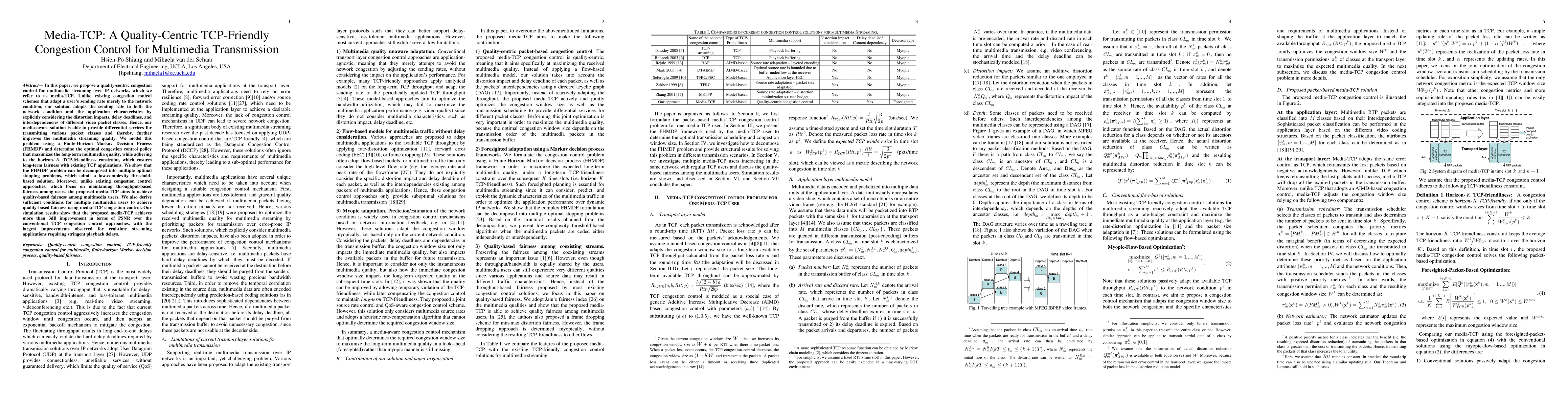 The paper proposes media-TCP, a congestion control scheme that adapts the sending rate based on both network conditions and application characteristics to enhance multimedia streaming quality. It uses a Finite-Horizon Markov Decision Process to determine an optimal policy that maximizes multimedia quality while maintaining TCP-friendliness, achieving significant improvements in PSNR over conventional TCP approaches.