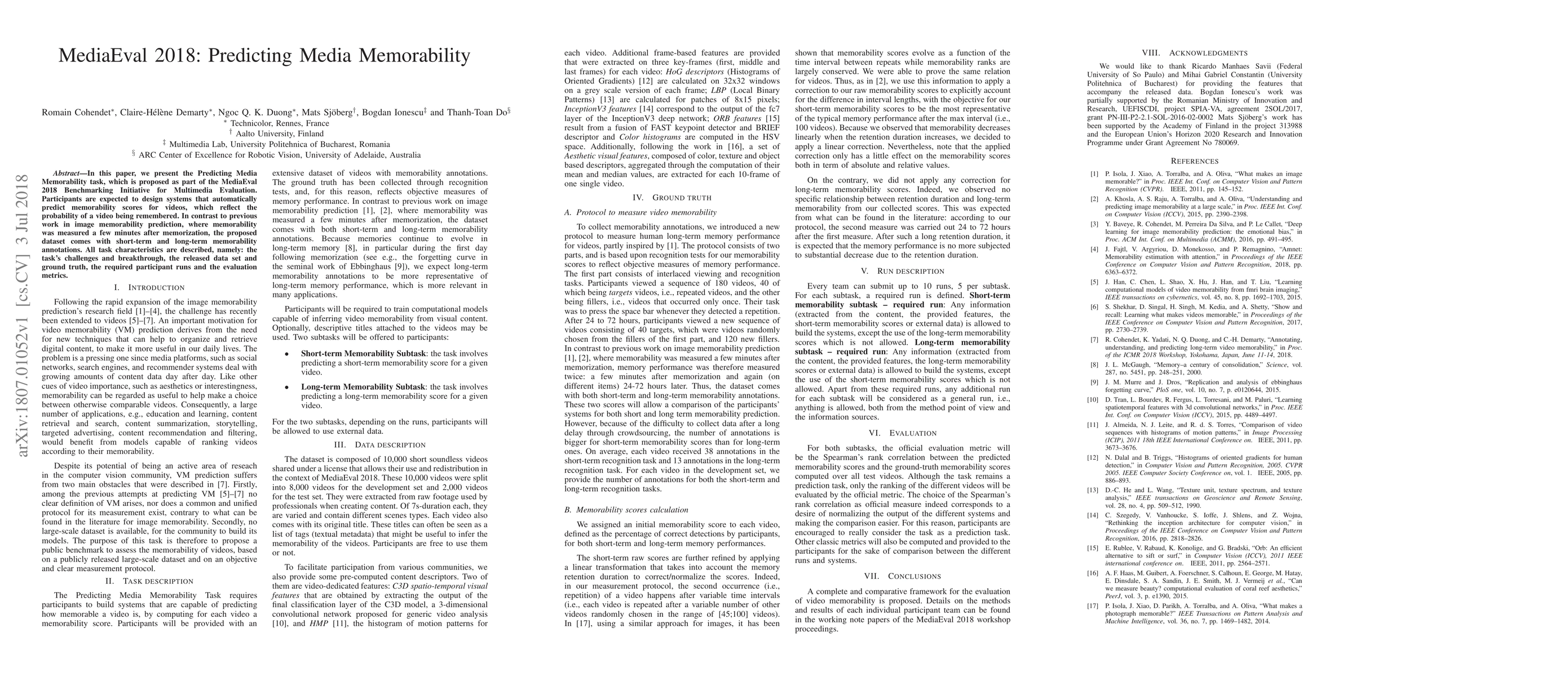 This paper introduces the Predicting Media Memorability task from MediaEval 2018, aiming to develop systems that automatically assess video memorability. It distinguishes itself by providing both short-term and long-term memorability annotations, unlike previous image-based studies.