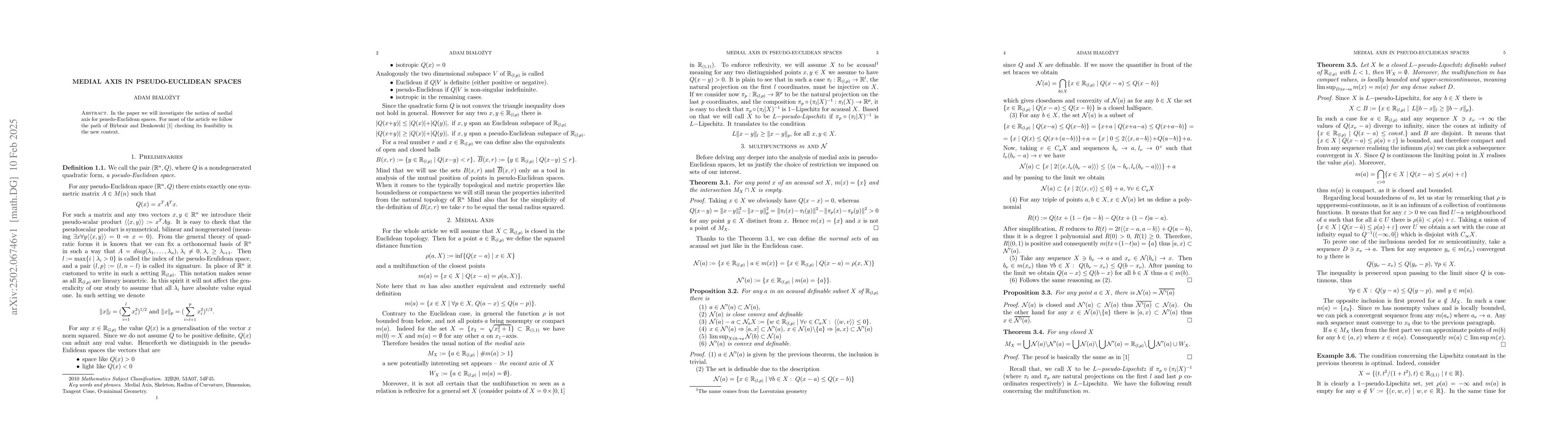 The paper extends the definition and properties of the medial axis to pseudo-Euclidean spaces, building on previous work in Euclidean spaces.