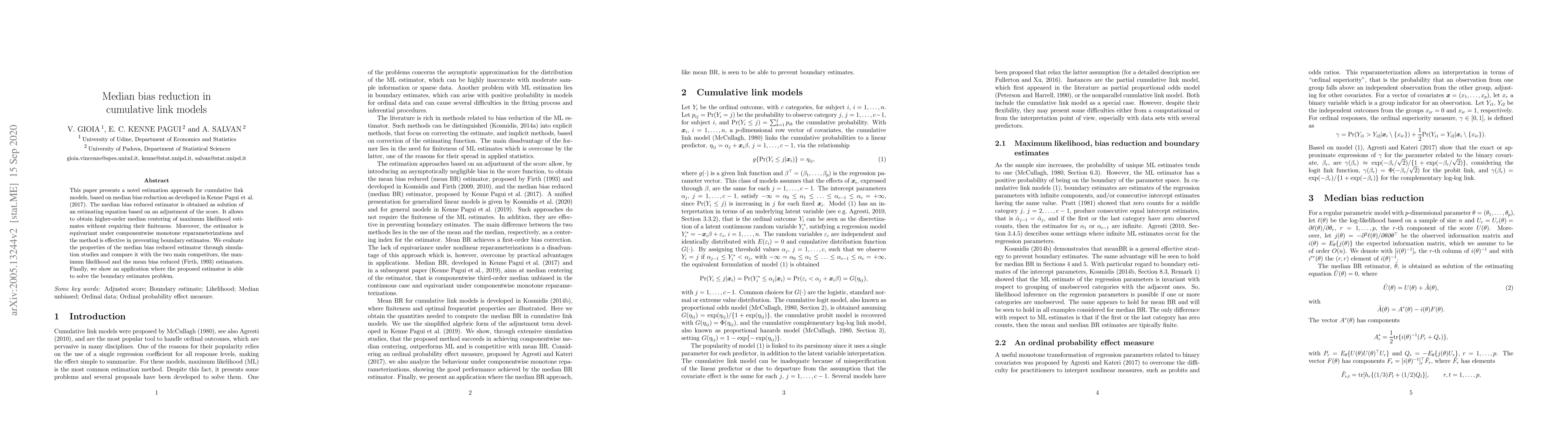 This paper introduces a median bias reduced estimator for cumulative link models, enhancing median centering without requiring finiteness of maximum likelihood estimates. It is shown to be effective in preventing boundary estimates and is compared favorably to maximum likelihood and mean bias reduced estimators through simulation studies.